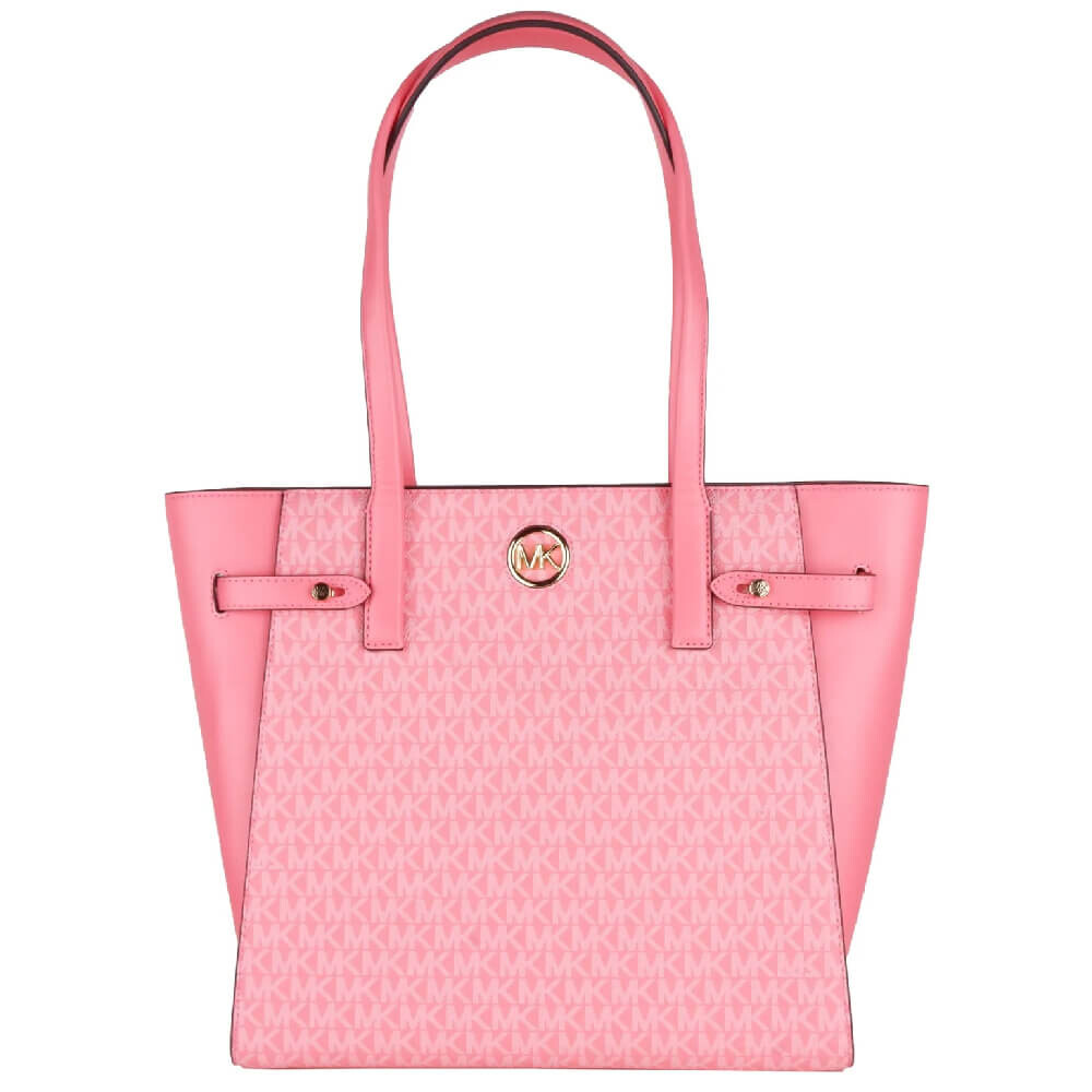 Сумка через плечо Michael Kors, розового цвета, металлический логотип бренда спереди, монограммы по всей поверхности, внутренний карман на молнии. Размер см - 40x30x15