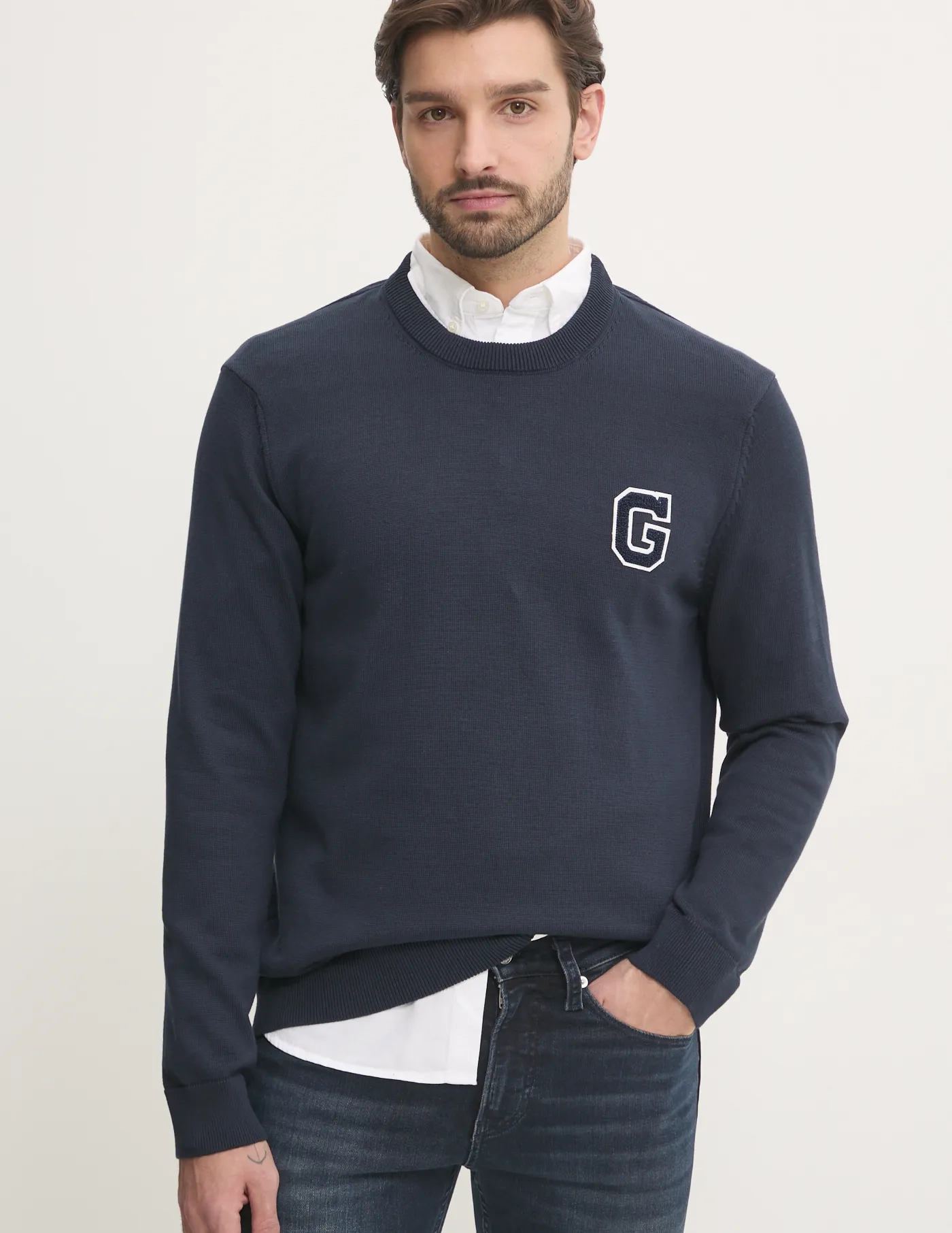 Гантовый вязаный свитер с аппликацией. Модель изготовлена ​​из дышащего хлопкового материала.