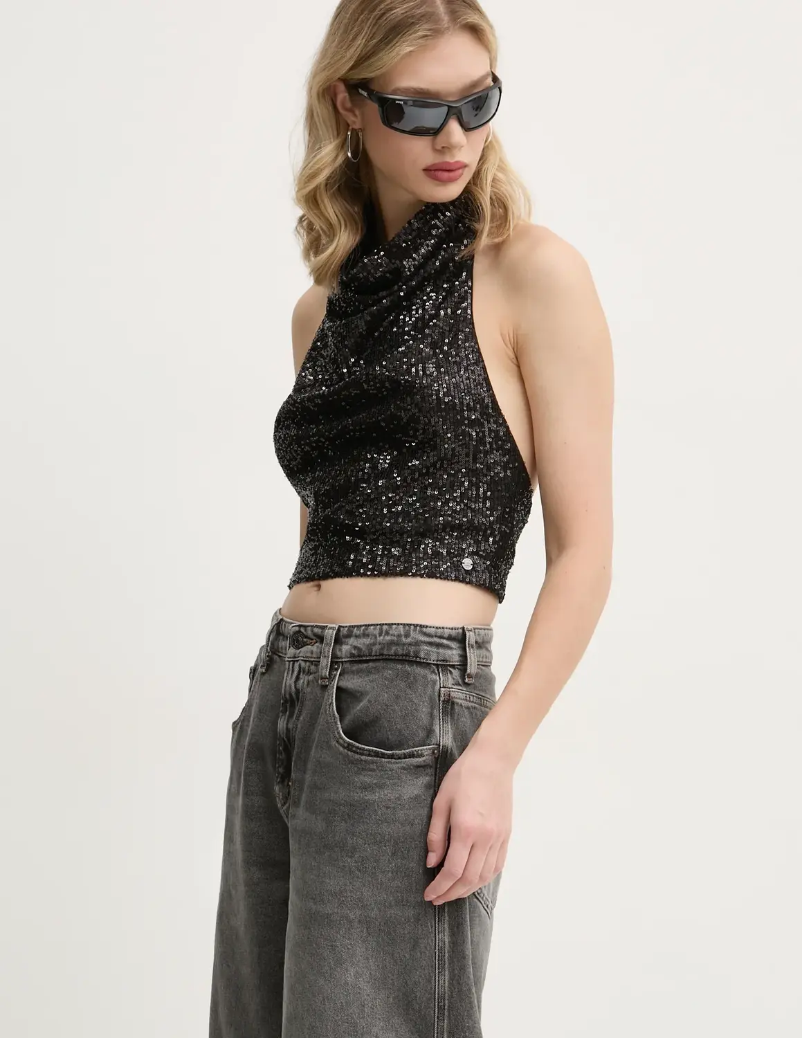 Суперсухая блузка. Изготовлен из материала с блестками. Блестящий и эффектный материал.