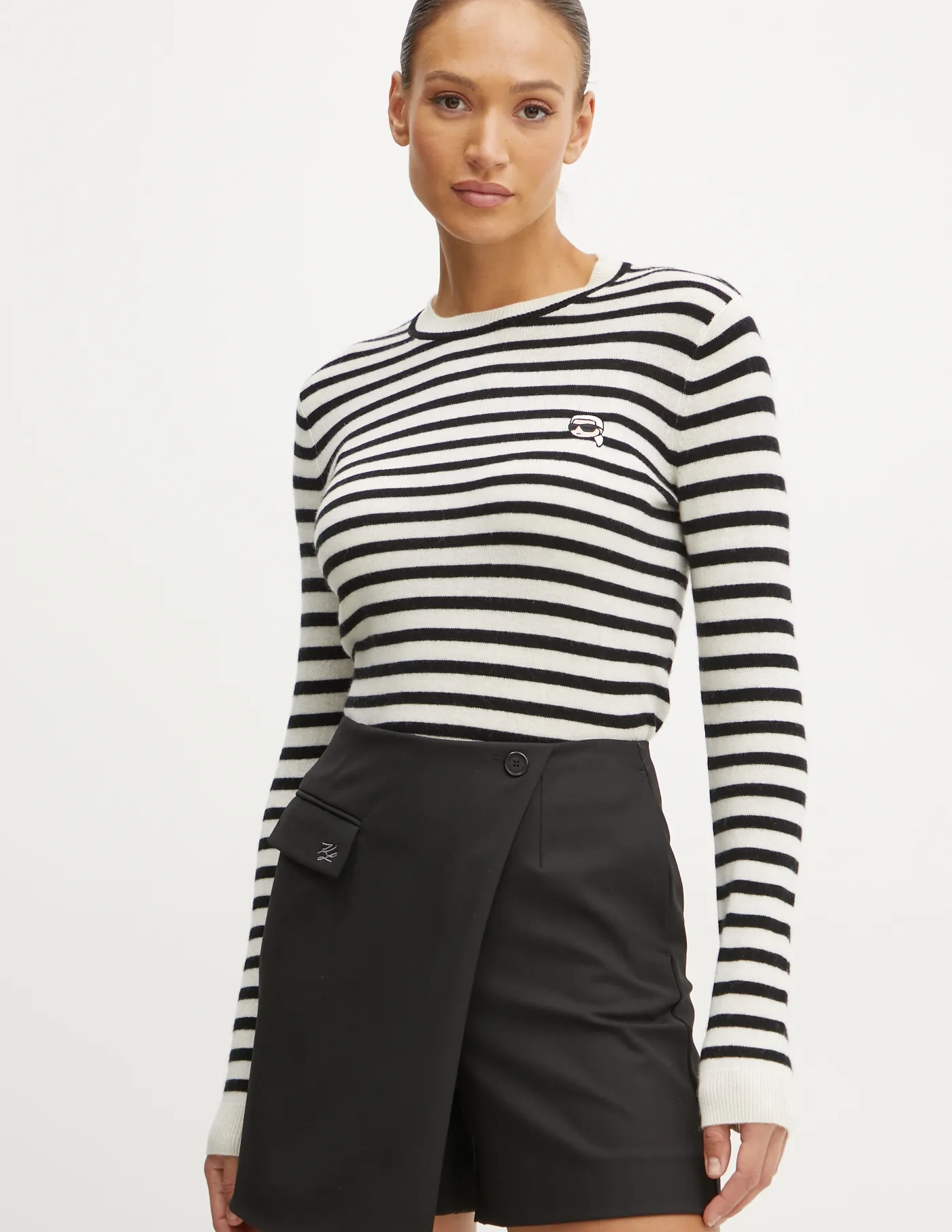 Свитер Karl Lagerfeld выполнен из узорчатого трикотажа. Шерсть, обладающая высокими терморегулирующими свойствами, помогает сохранять тепло, когда холодно, и прохладу, когда жарко.