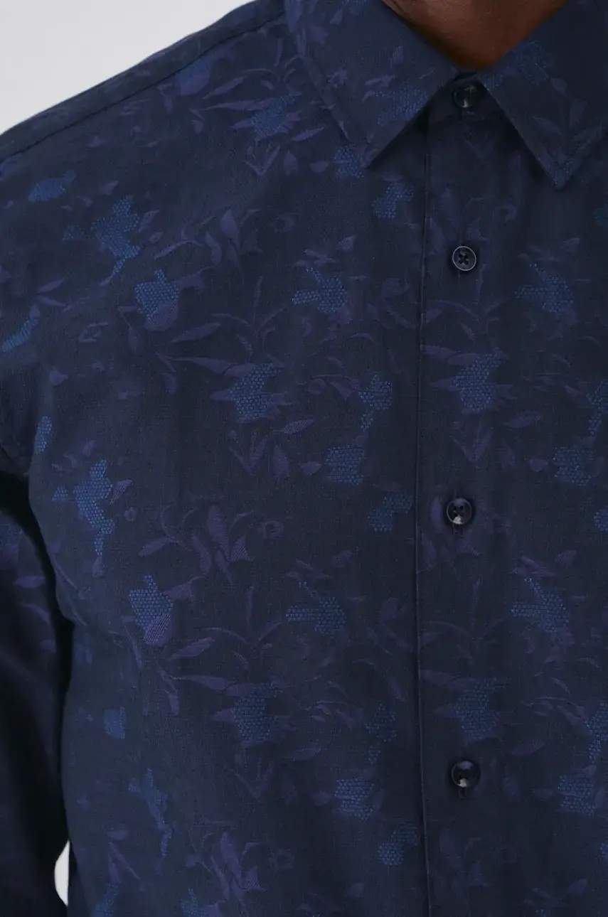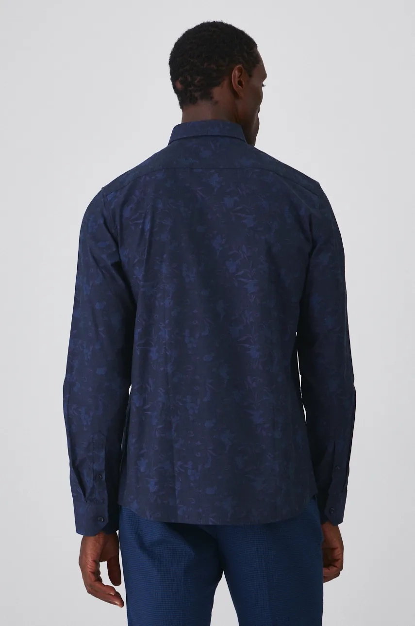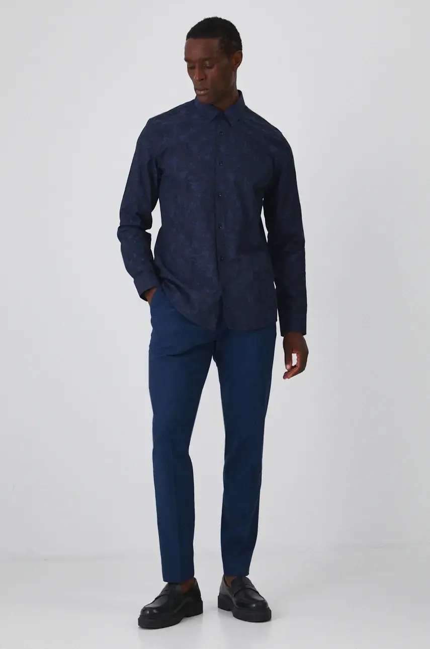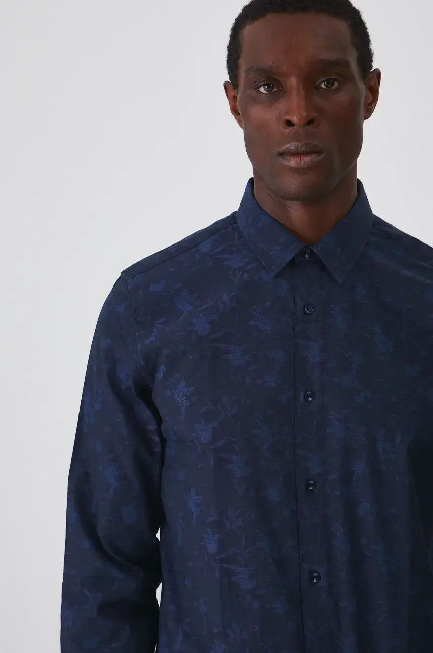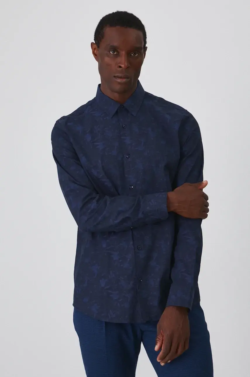 Медицинская рубашка. Изготовлен из узорчатой ​​ткани. Оснащен классическим мягким воротником.