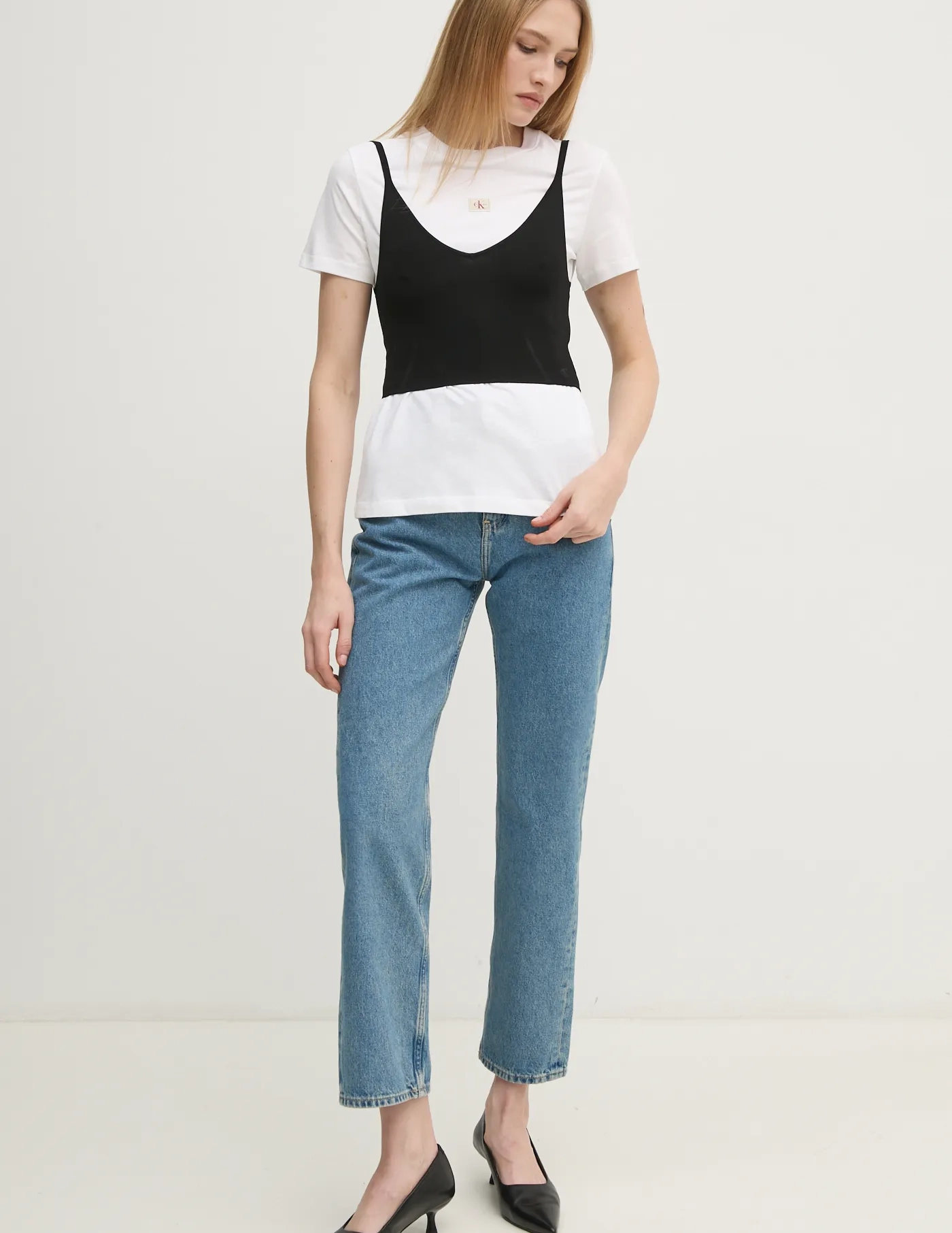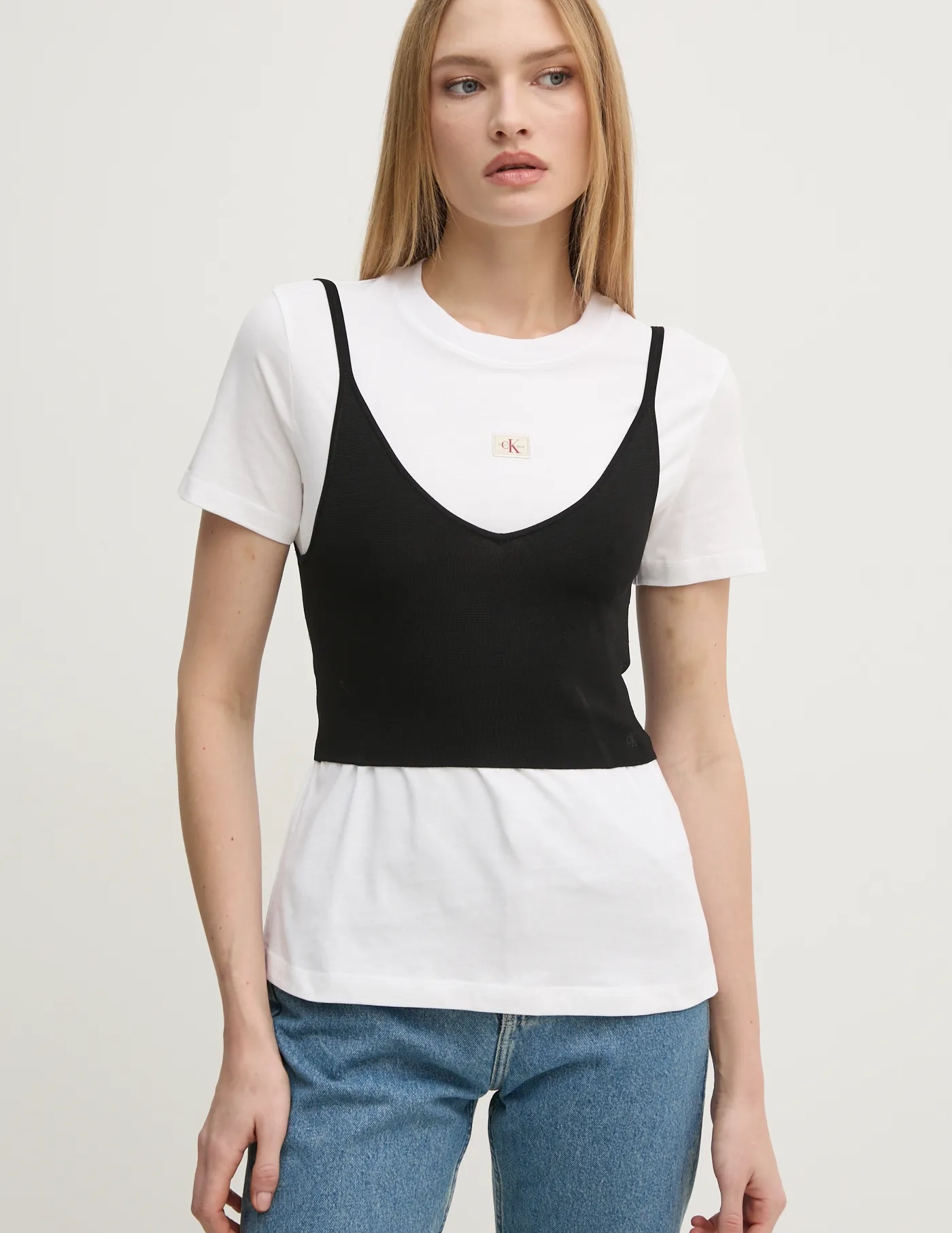 Топы Calvin Klein Jeans. Изготовлен из однотонного трикотажа. Модель изготовлена ​​из чрезвычайно комфортной ткани с высоким содержанием вискозы.