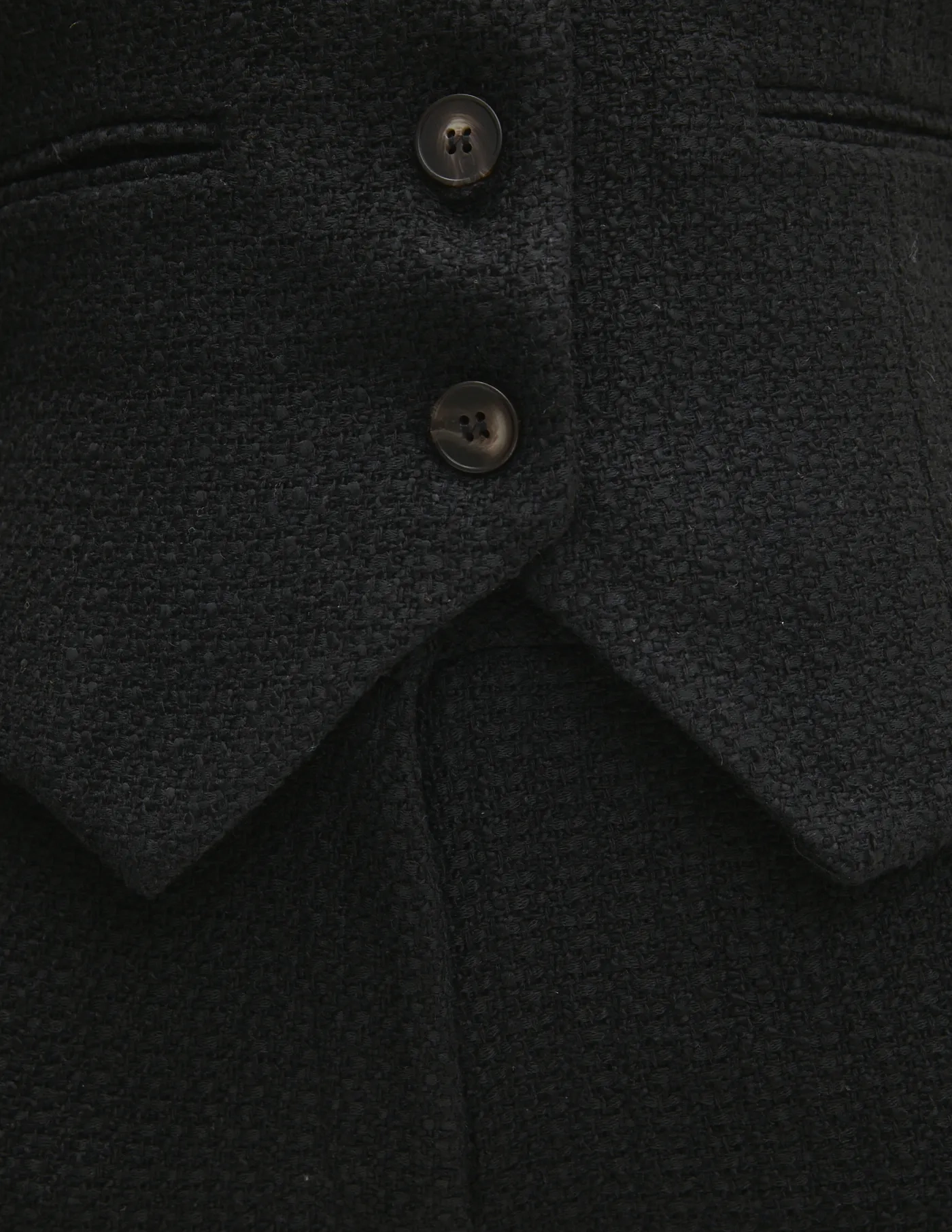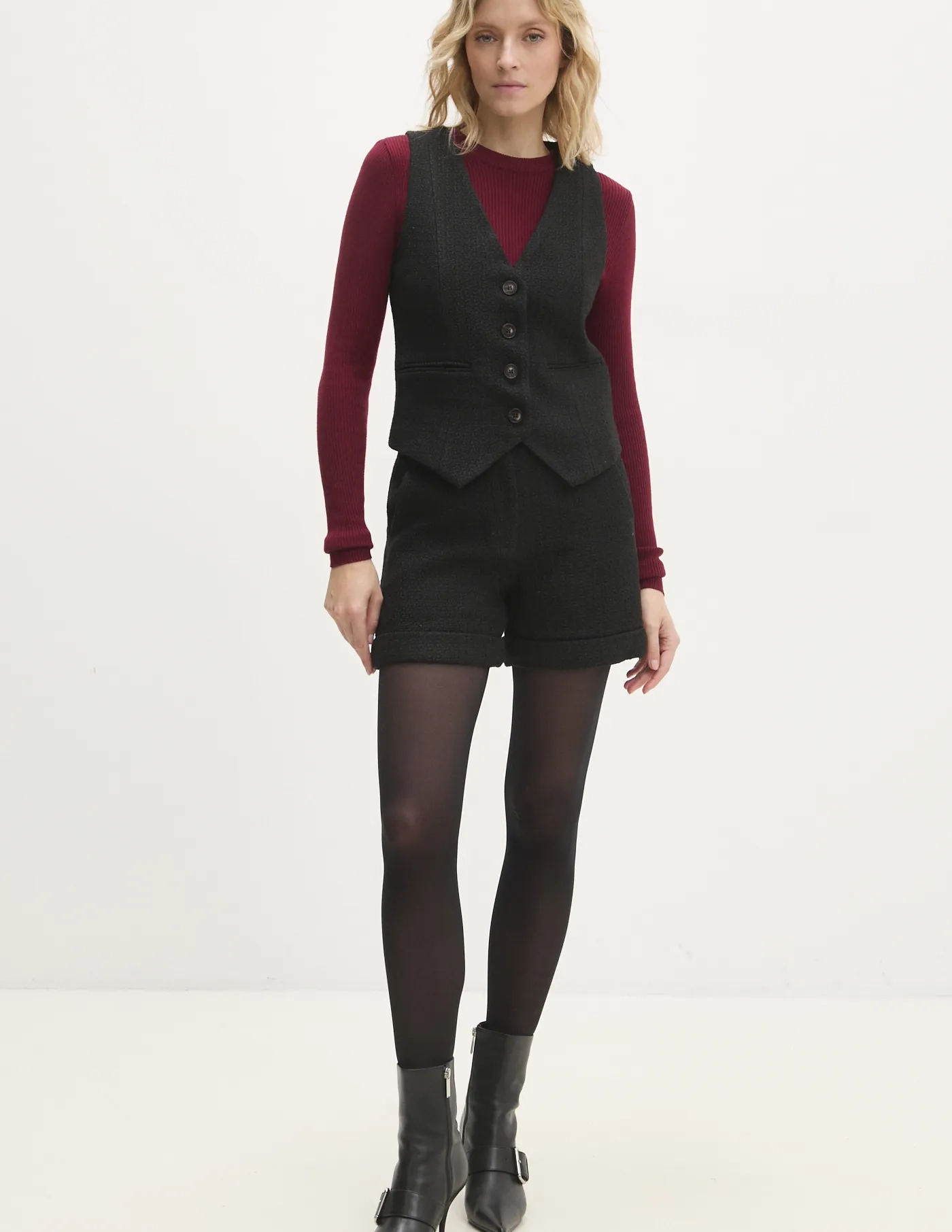 - Модель с высокой талией, застежкой на пуговицы и молнию.