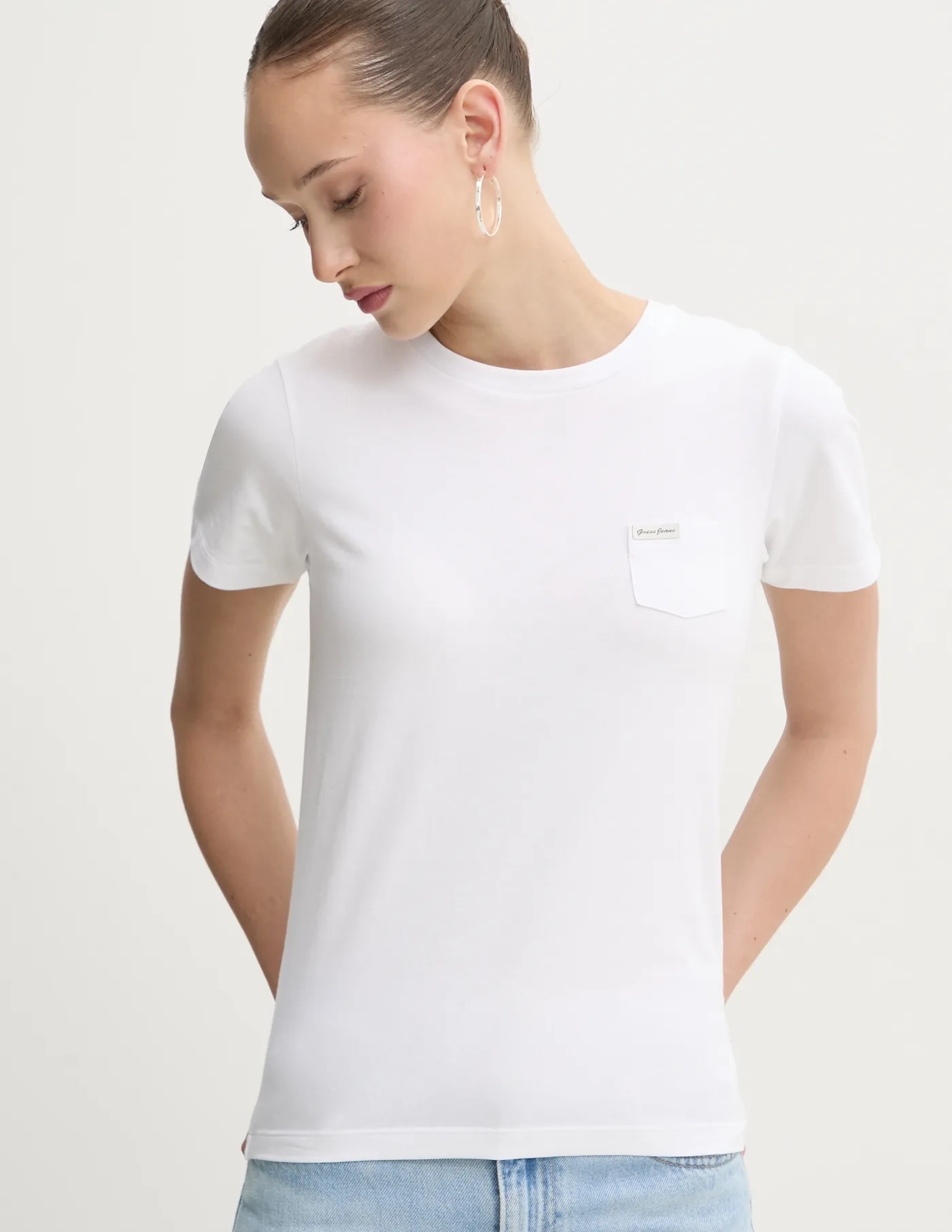 Футболка Guess Jeans изготовлена ​​из тонкого эластичного трикотажа. Модель изготовлена ​​из дышащего материала с высоким процентом хлопка.