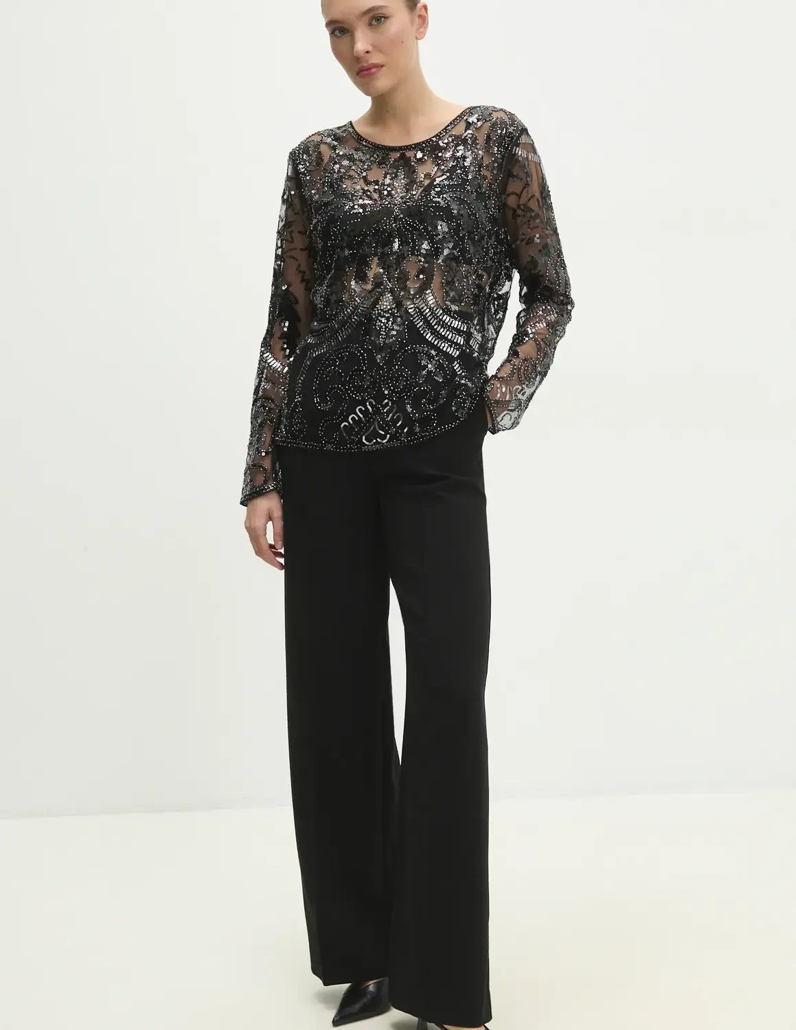 Блузка Answear Lab. Изготовлен из прозрачного материала. Модель со сверкающими и впечатляющими аппликациями.