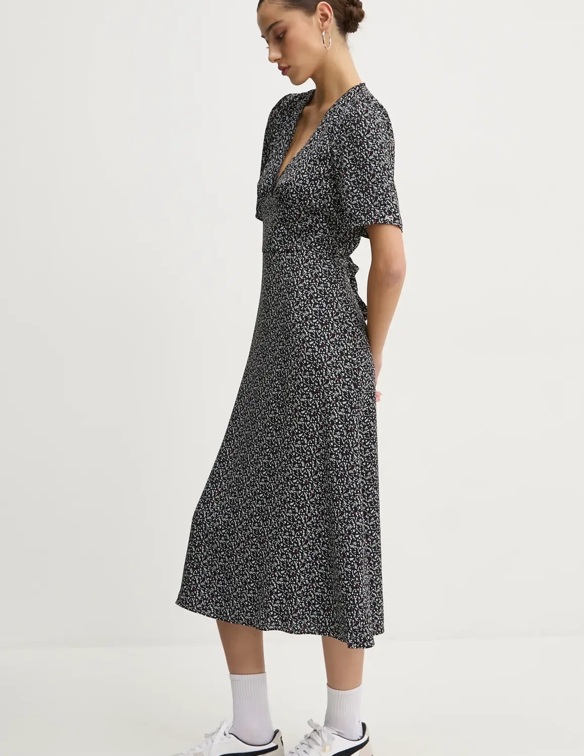 Платье Томми Джинс. Изготовлен из узорчатой ​​ткани. Модель изготовлена ​​из чрезвычайно комфортной и дышащей ткани.
