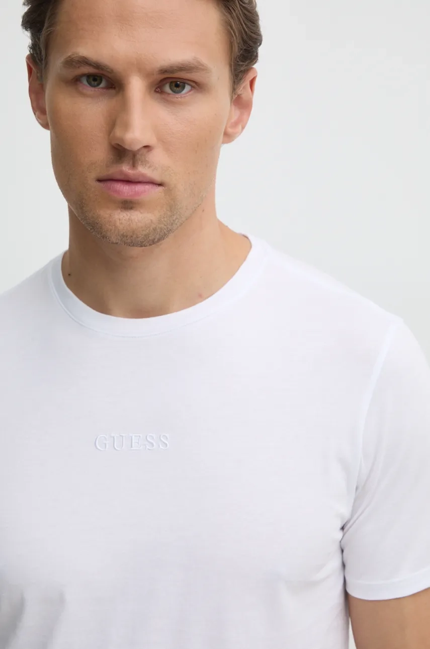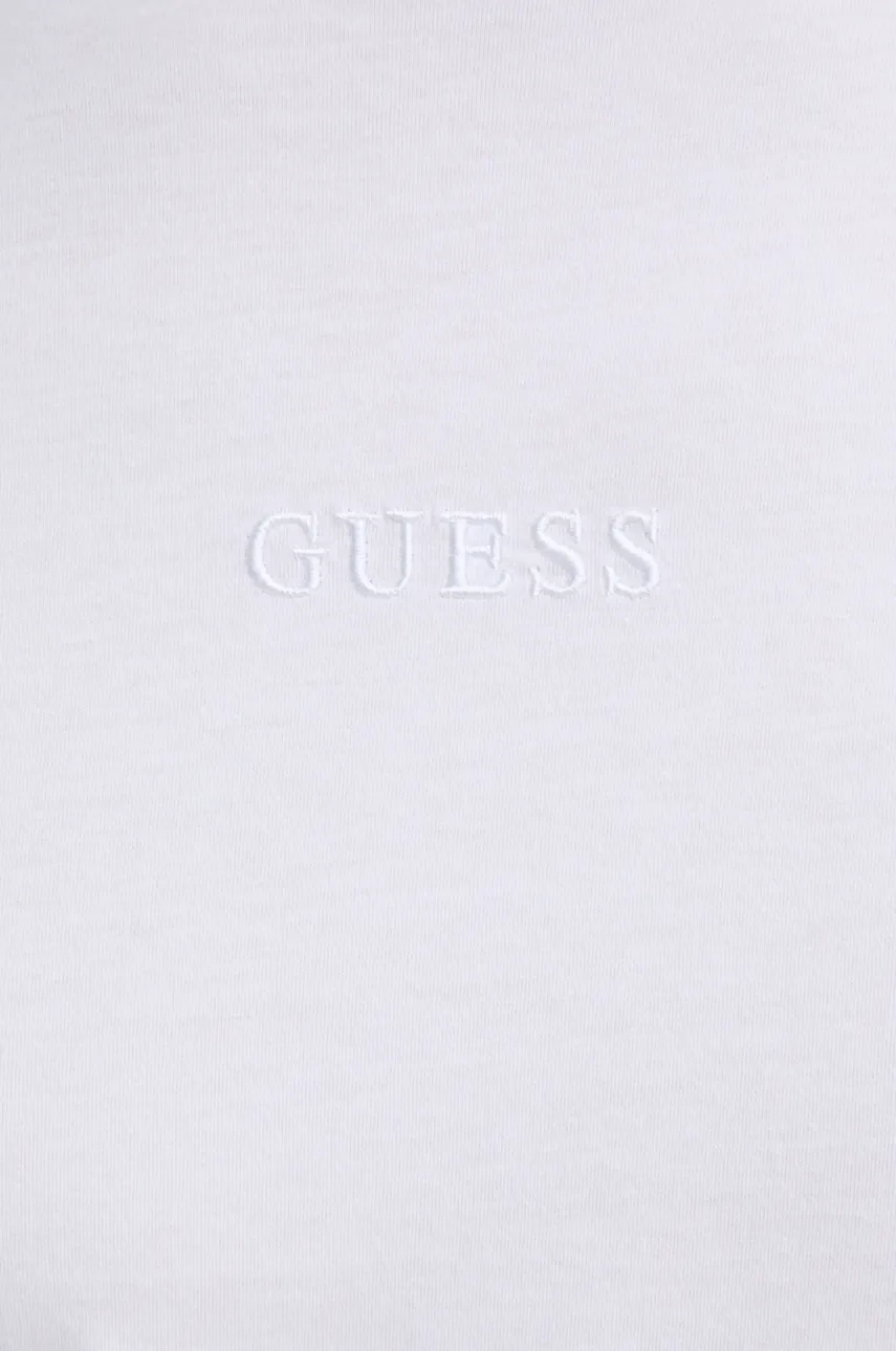 Футболка Guess выполнена из однотонного трикотажа. Модель изготовлена ​​из очень комфортной хлопковой ткани.