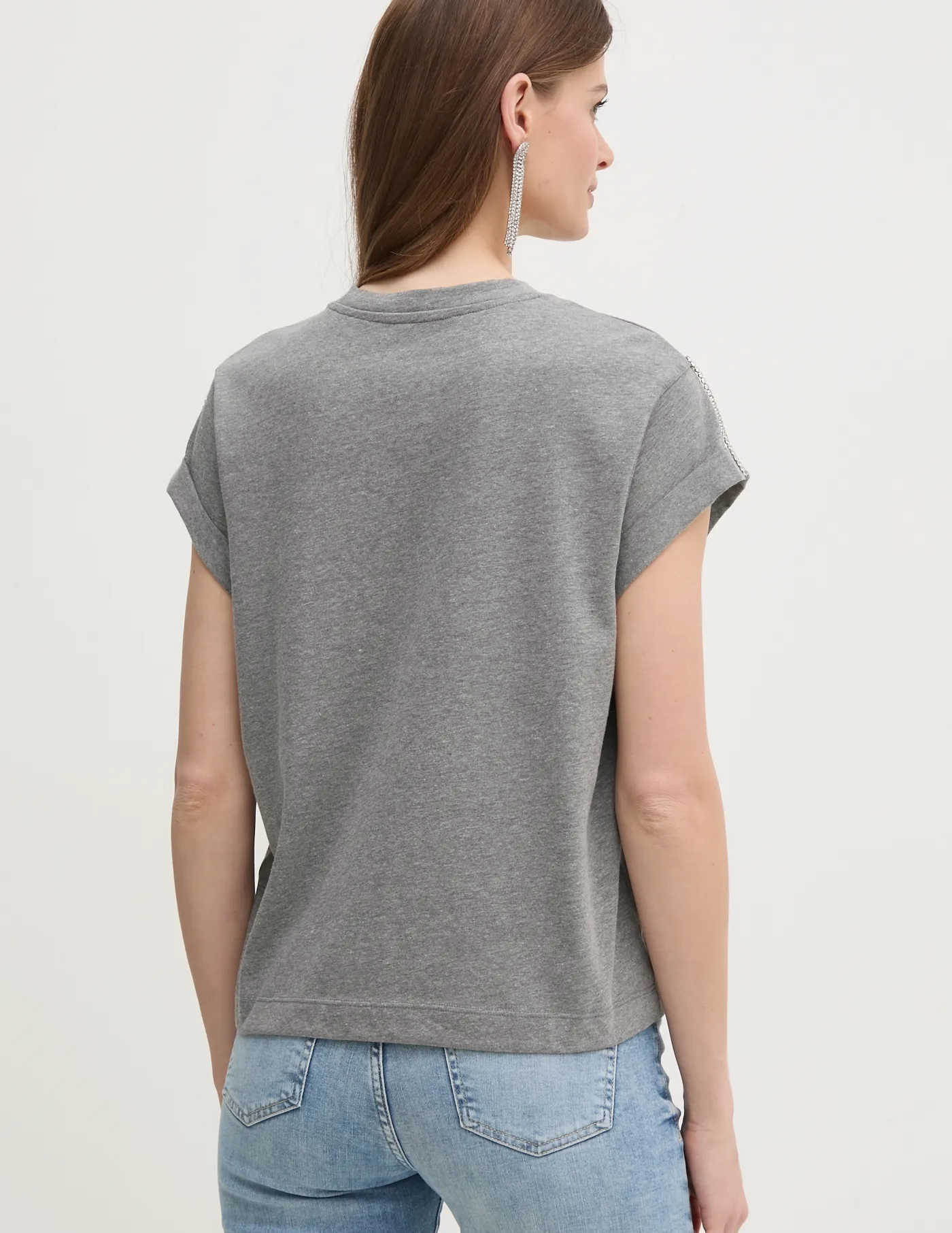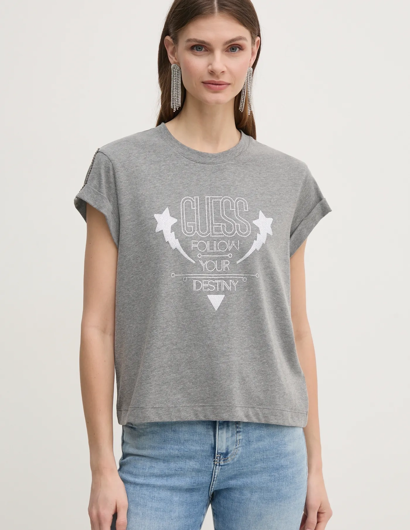 Футболка Guess из трикотажа с аппликацией. Модель изготовлена ​​из чрезвычайно комфортной ткани с высоким процентом хлопка.