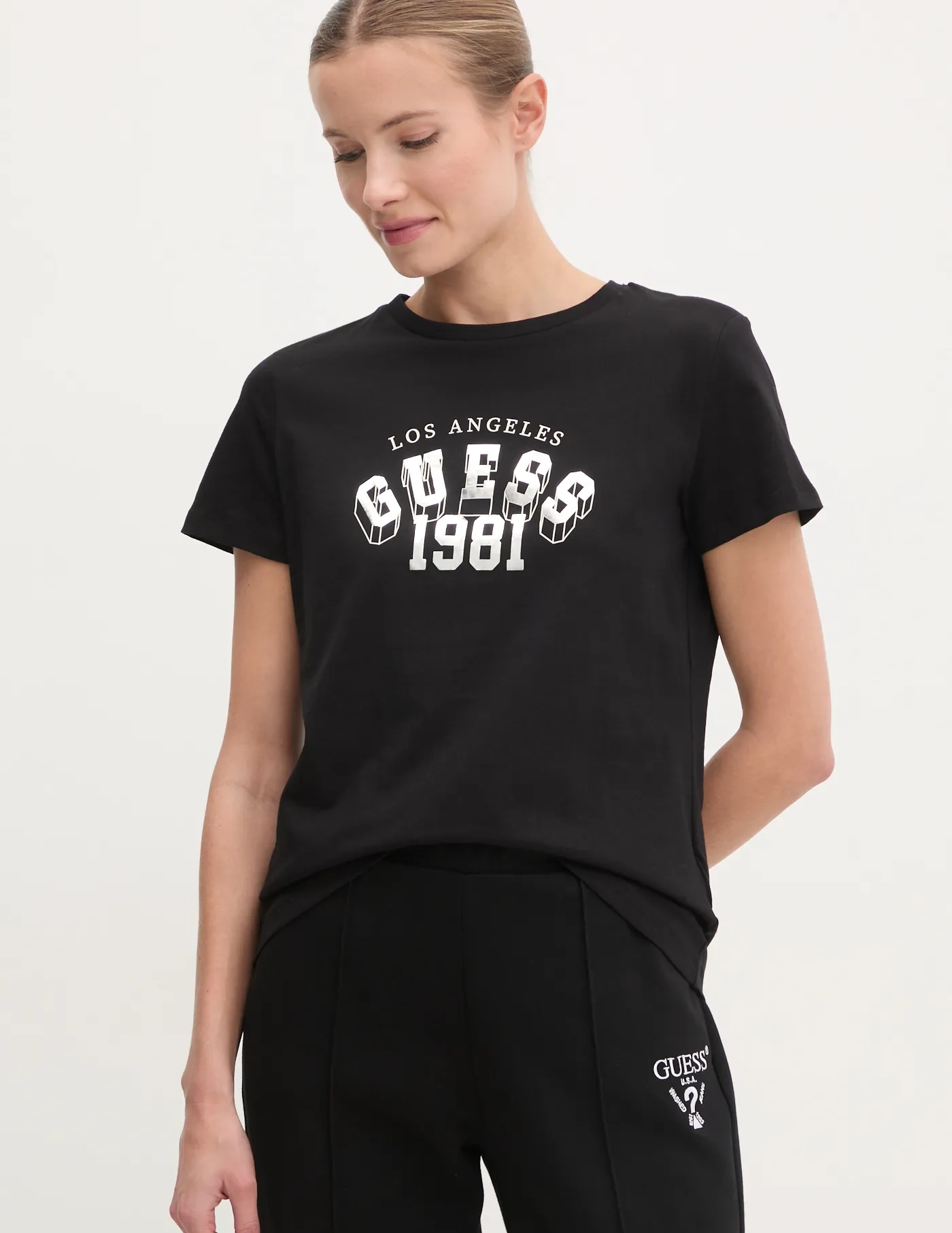 Футболка Guess из трикотажного полотна с принтом. Модель изготовлена ​​из очень комфортной хлопковой ткани.