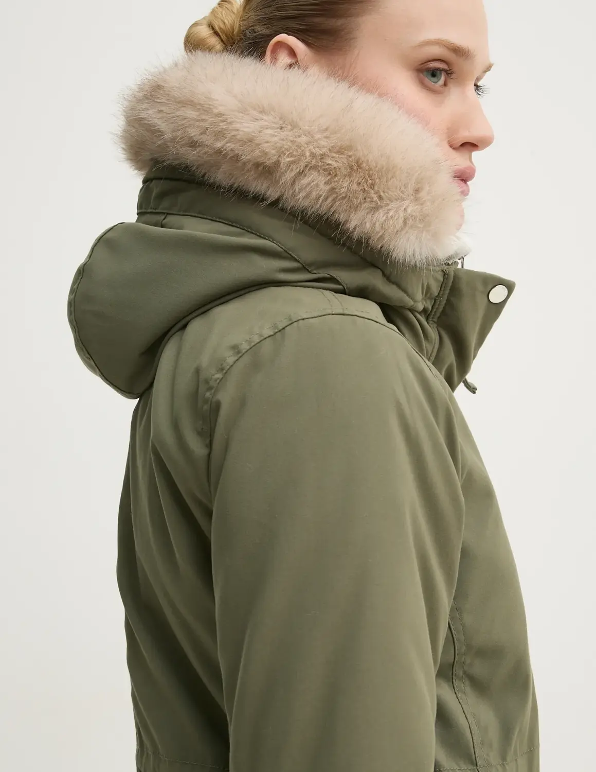 - Высокий воротник и съемный капюшон обеспечивают дополнительную защиту от холода.
