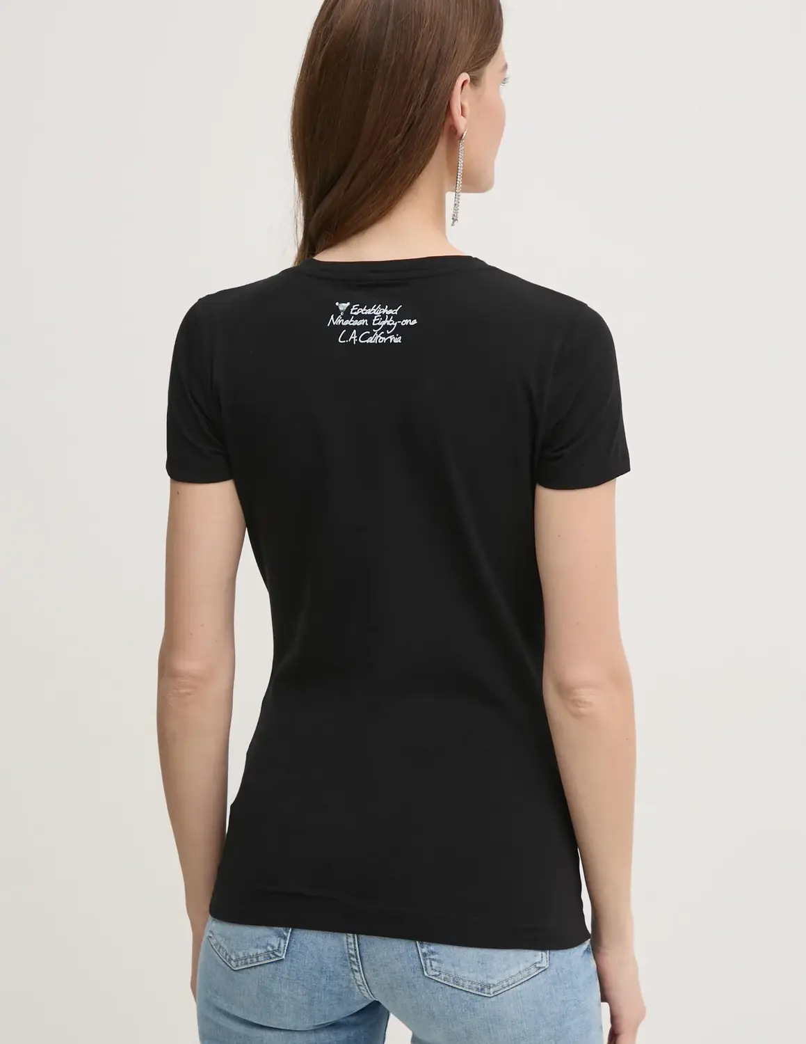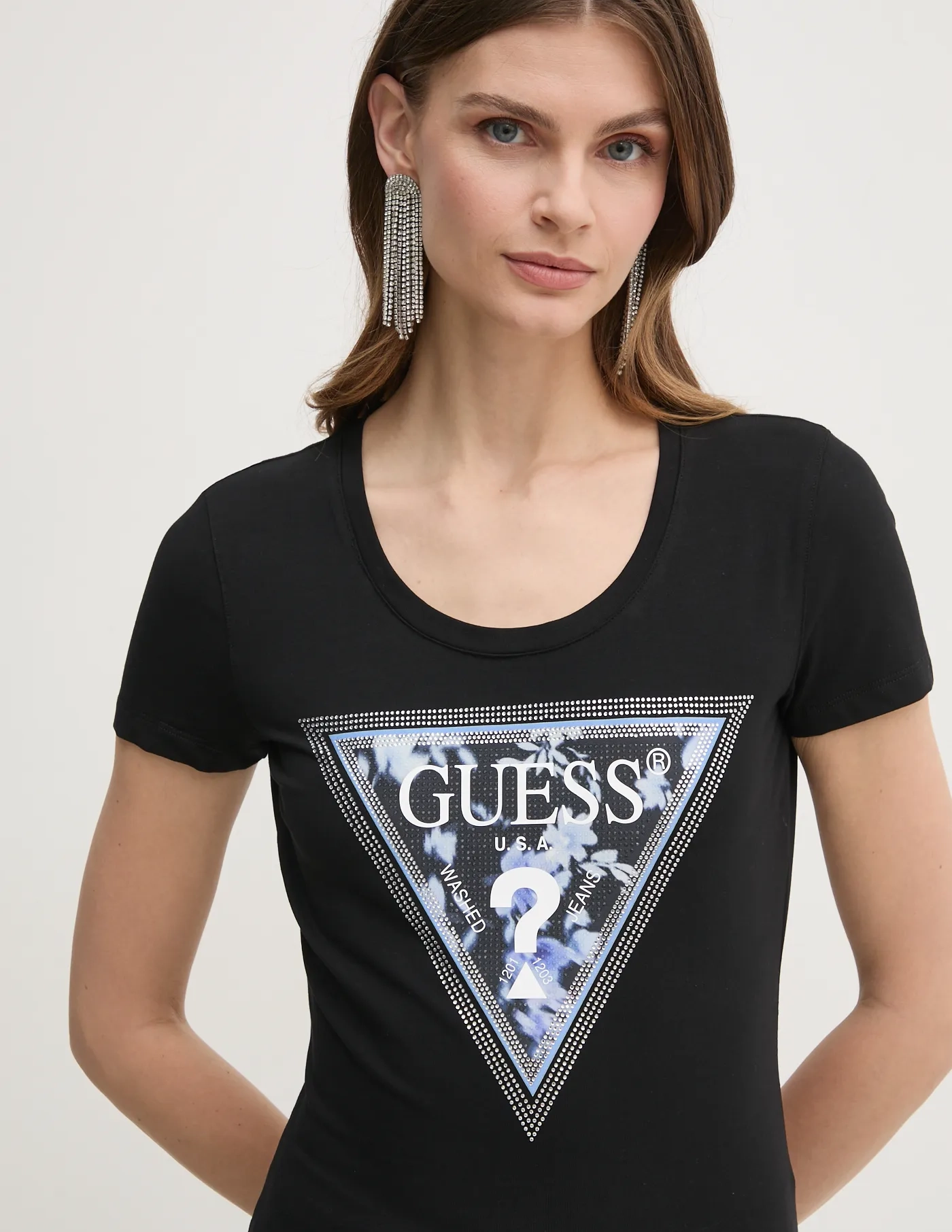 Футболка Guess из трикотажа с аппликацией. Модель изготовлена ​​из чрезвычайно комфортной ткани с высоким процентом хлопка.