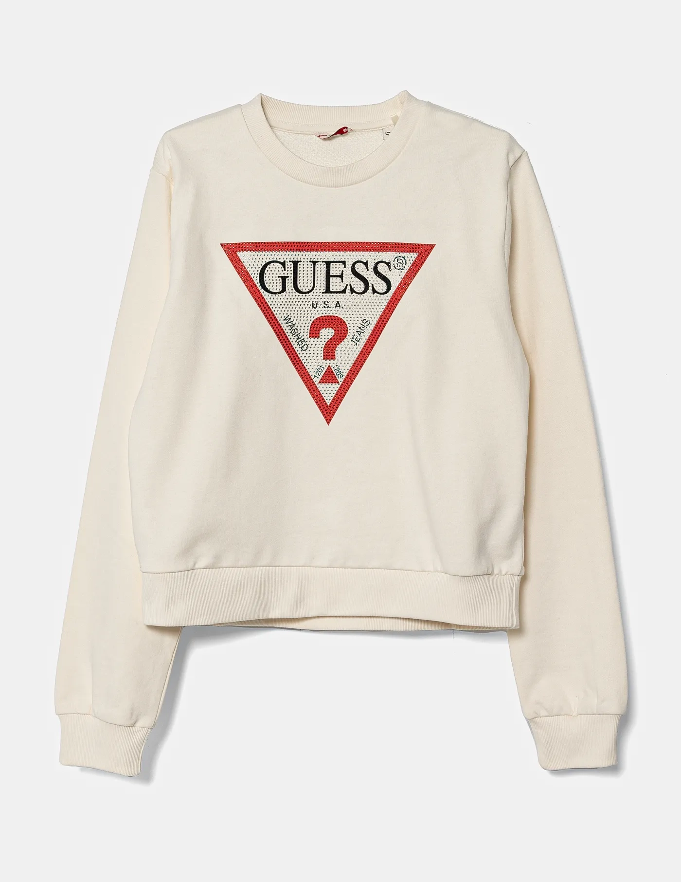 Guess детский свитшот. Вязаная модель с аппликациями. Модель изготовлена ​​из очень комфортной хлопковой ткани.
