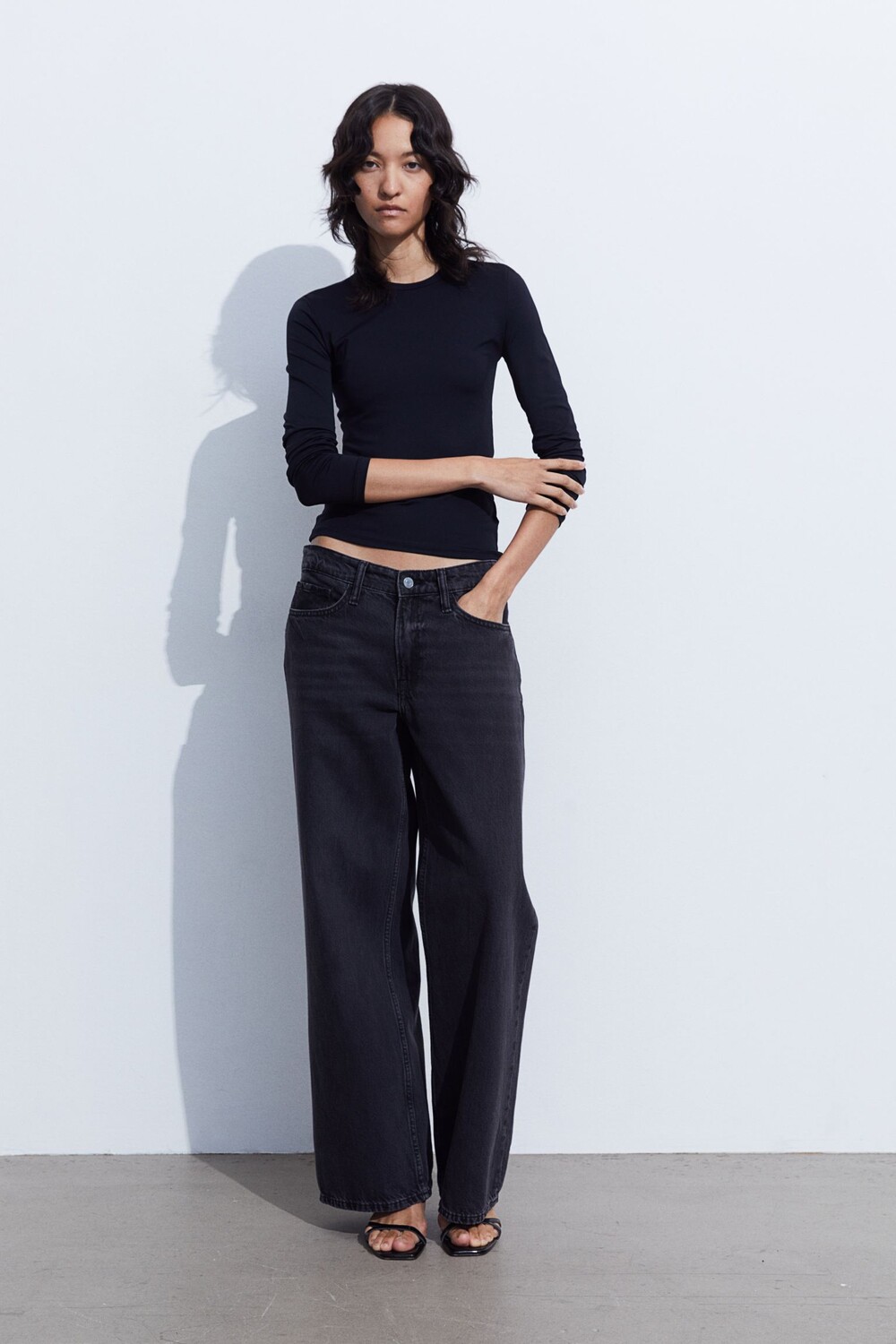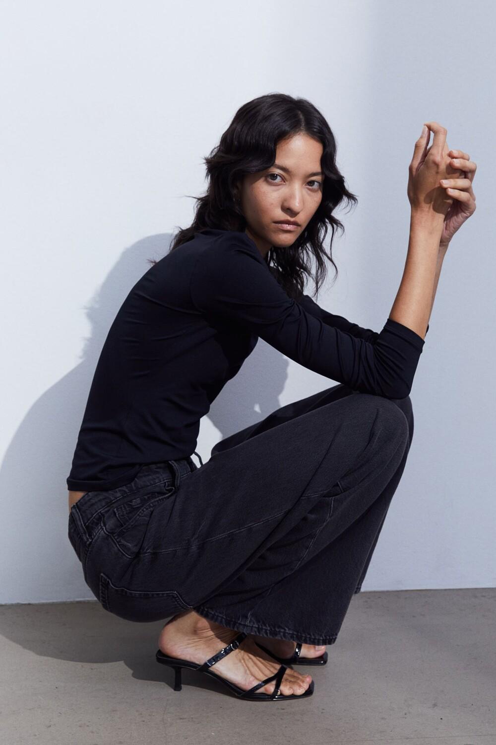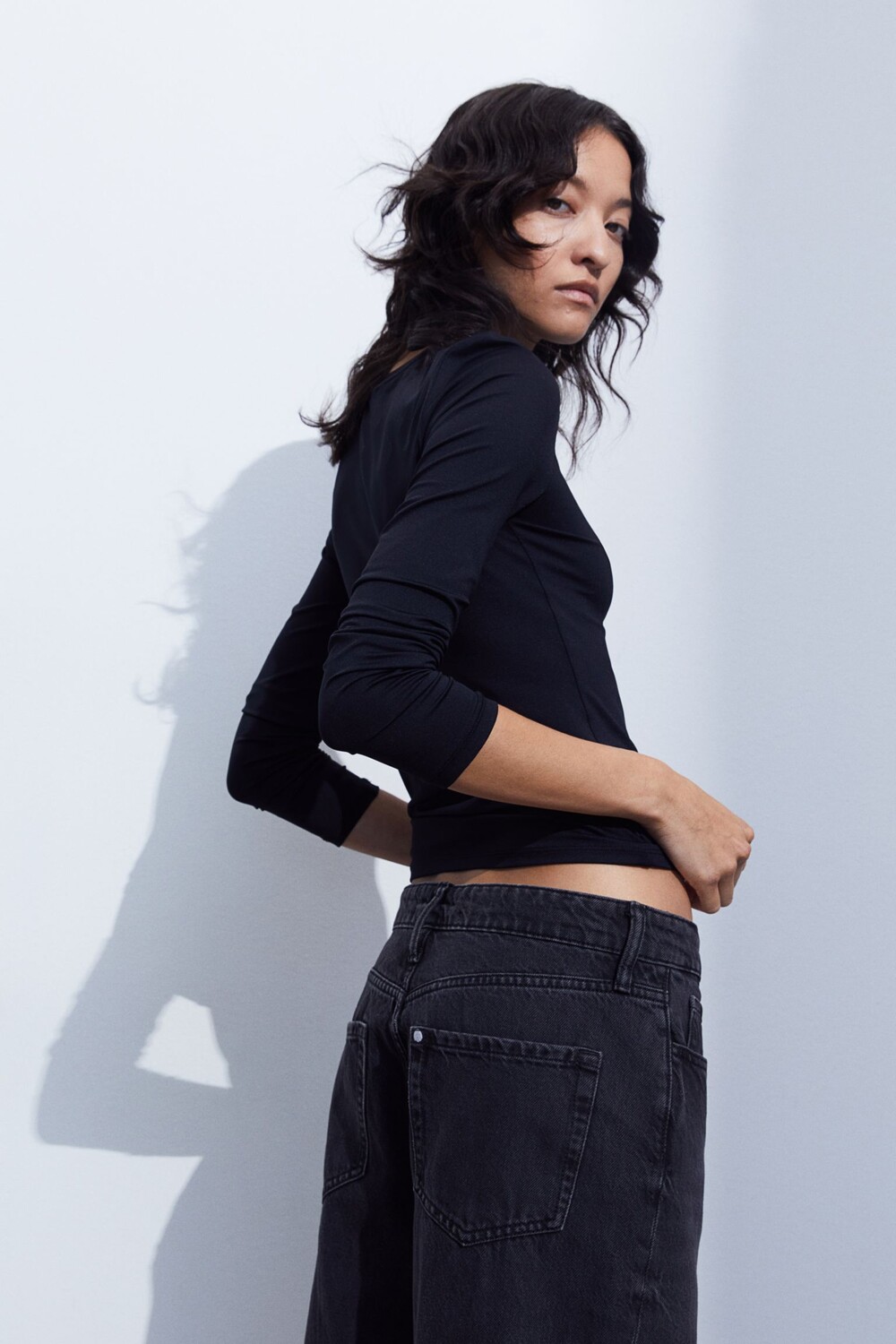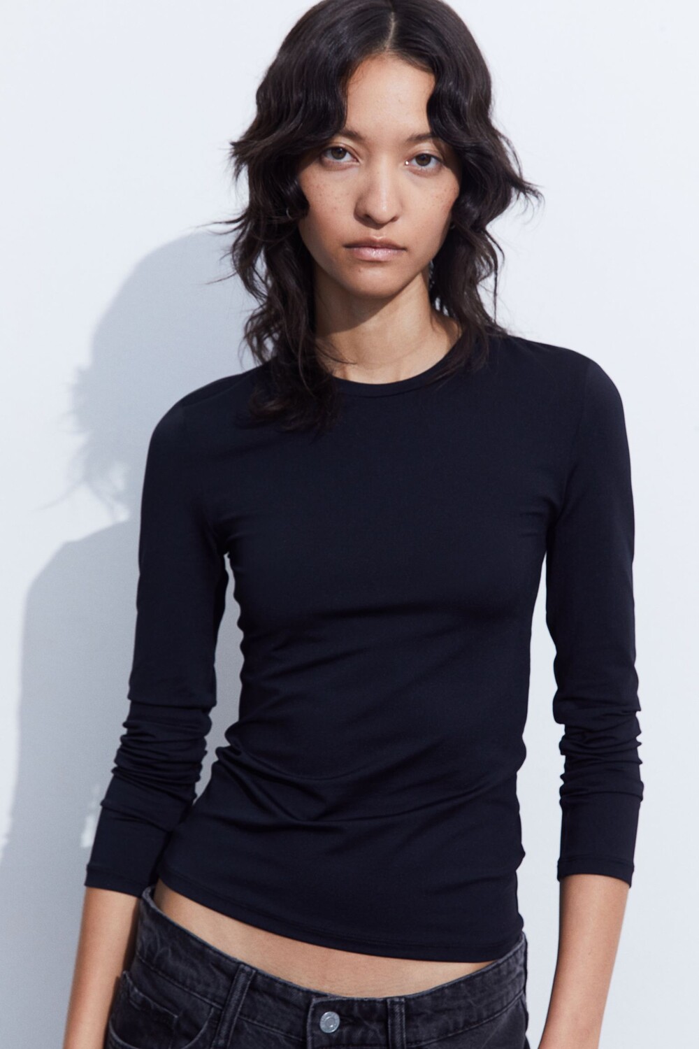Облегающий топ из мягкого трикотажа с круглым вырезом и длинными рукавами. Узкая окантовка вокруг выреза горловины.