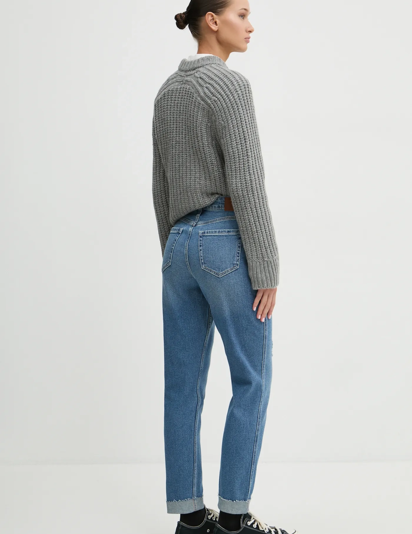 - Модель с завышенной талией, застежкой на пуговицу и молнию.