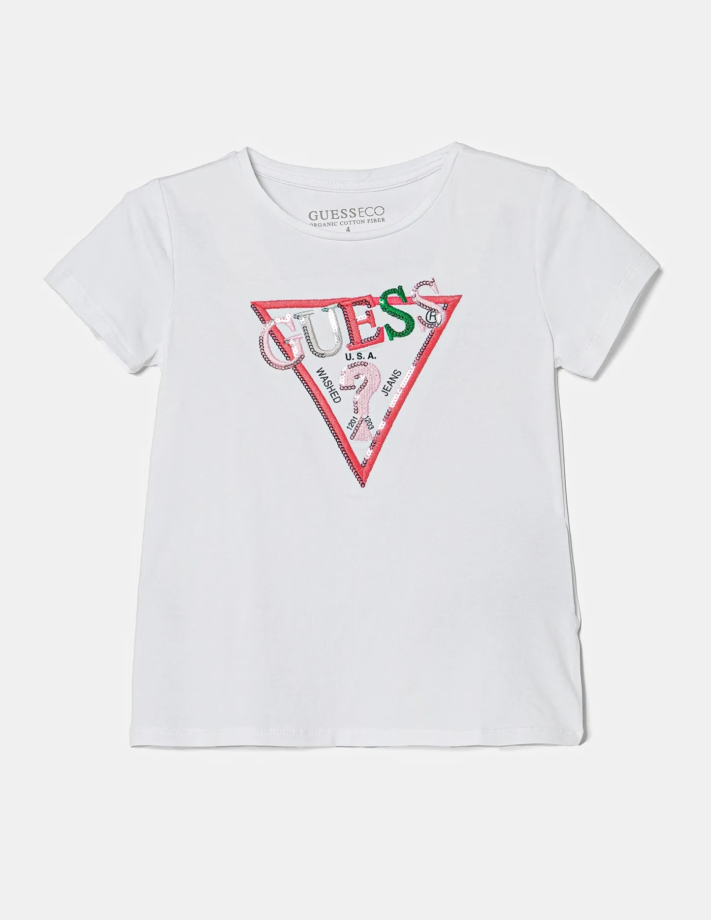 Guess детскую футболку. Изготовлен из трикотажа с аппликацией. Модель изготовлена ​​из чрезвычайно комфортной ткани с высоким процентом хлопка.