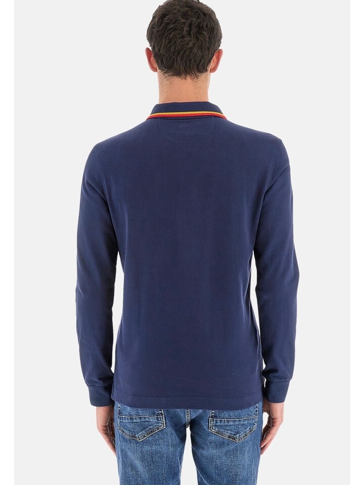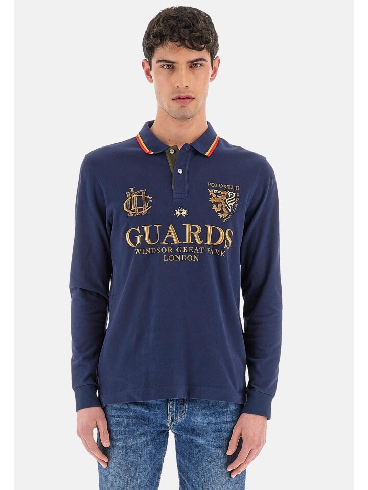 Мужская рубашка-поло La Martina из линии Guards с классическим воротником, контрастной окантовкой и застежкой на две пуговицы обычного кроя. Дизайн дополняет крупный принт надписи «Гвардия» с ее логотипом и вышитая линейная нашивка. Этот предмет одежды, являющийся неотъемлемой частью коллекции, хорошо сочетается с джинсами или брюками, создавая повседневный и удобный образ.