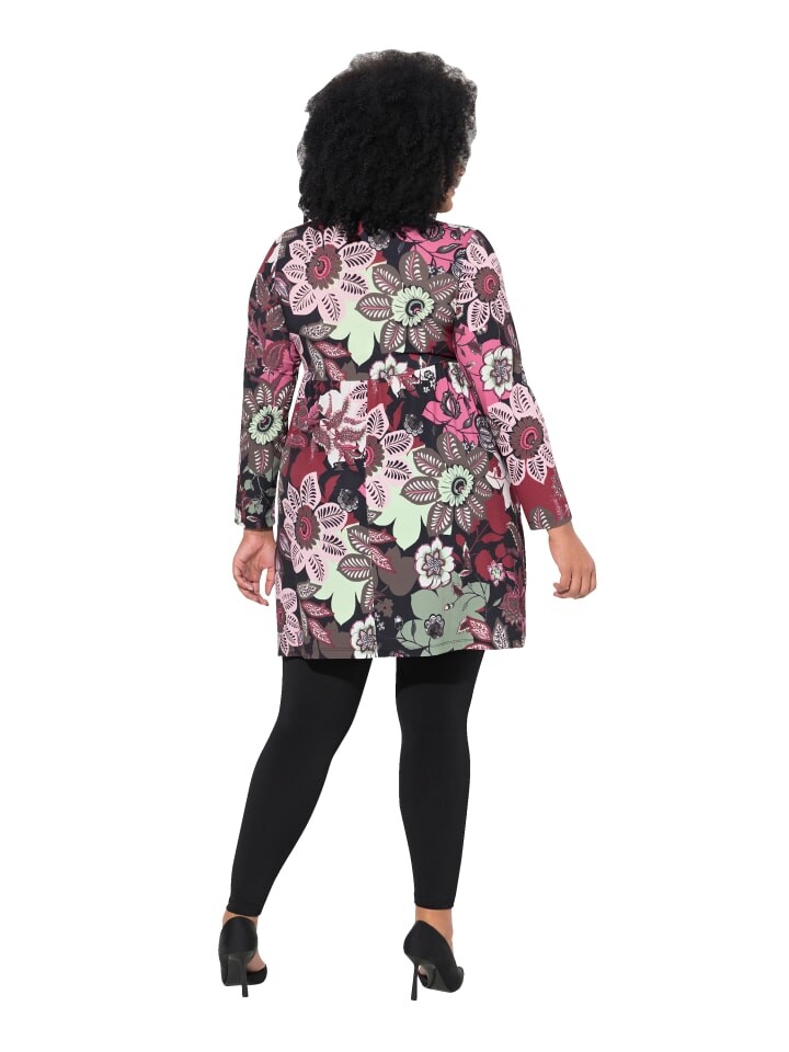 Длинная рубашка А-силуэта из очень гладкого трикотажа с принтом по всей поверхности. Круглый вырез горловины с небольшой каплевидной вырезкой, эластичный поперечный шов под грудью. Длинный рукав. Удобная ширина нижнего края.