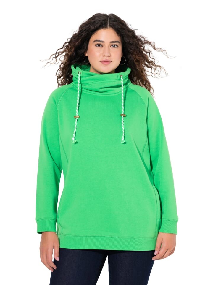 Толстовка с воротником стойкой и завязывающимся ремешком. Спортивная форма реглан. Карманы в разделительных швах. Длинные рукава и ребристые манжеты. Длина по размеру: около 72-82 см. Модный свитшот с широким воротником-стойкой и завязывающимся ремешком. Спортивная форма реглан с карманами в разделительных швах, длинными рукавами и ребристыми манжетами. Этот свитшот незаменим в любом гардеробе и идеален для комбинирования. Можно стирать в машине.