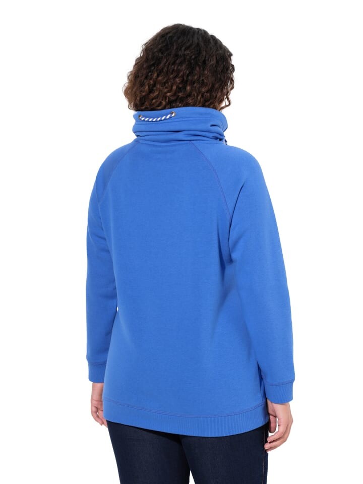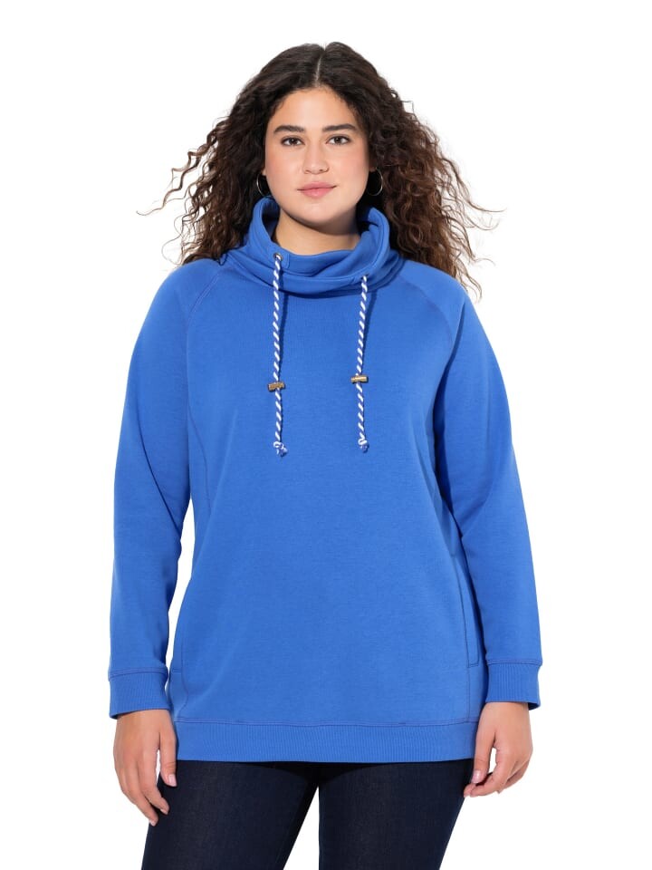 Толстовка с воротником стойкой и завязывающимся ремешком. Спортивная форма реглан. Карманы в разделительных швах. Длинные рукава и ребристые манжеты. Длина по размеру: около 72-82 см. Модный свитшот с широким воротником-стойкой и завязывающимся ремешком. Спортивная форма реглан с карманами в разделительных швах, длинными рукавами и ребристыми манжетами. Этот свитшот незаменим в любом гардеробе и идеален для комбинирования. Можно стирать в машине.
