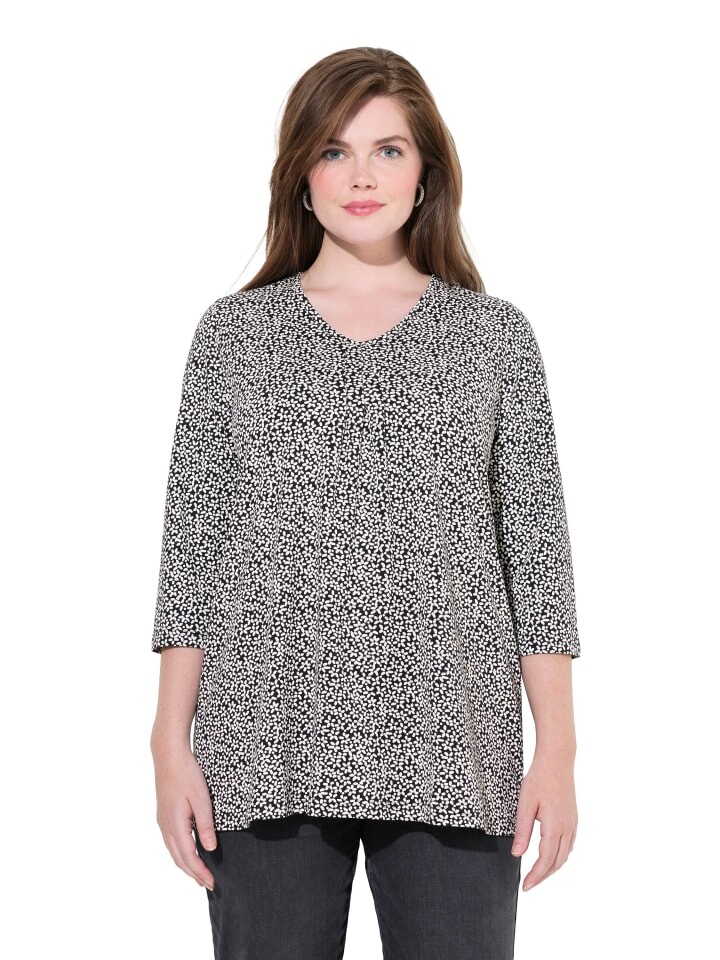 Футболка А-силуэта из мягкого трикотажа с цветочным узором. V-образный вырез с декоративными складками, рукава 3/4.
