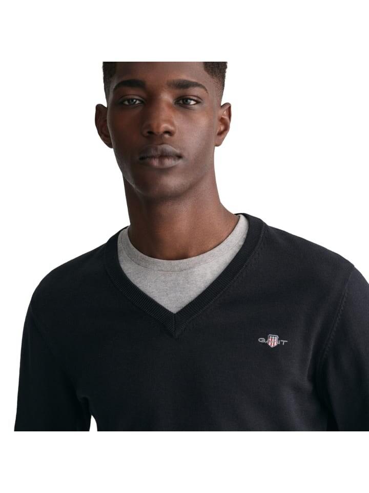 Простой свитер с V-образным вырезом от бренда GANT. Тонкий трикотаж из чистого хлопка, манжеты и нижний край в рубчик, небольшая вышивка логотипа, стандартный крой.