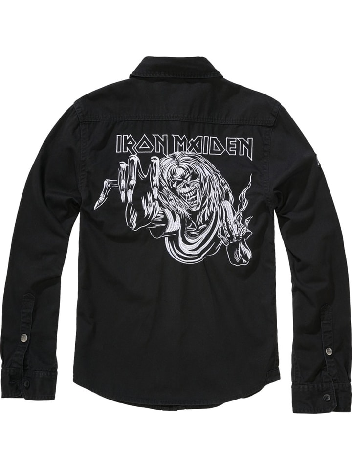 Рубашка в винтажном стиле с длинным рукавом / вышивка Iron Maiden спереди / металлическая булавка Iron Maiden / пуговицы с логотипом / большой принт Iron Maiden сзади / два накладных нагрудных кармана / погоны