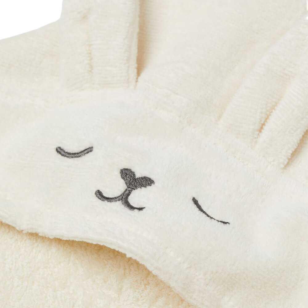 Мягкое махровое полотенце из хлопка с красивым капюшоном, вышитой мордочкой кролика и пришитыми ушками отлично согреет малыша после купания. Размер 80*80 см.