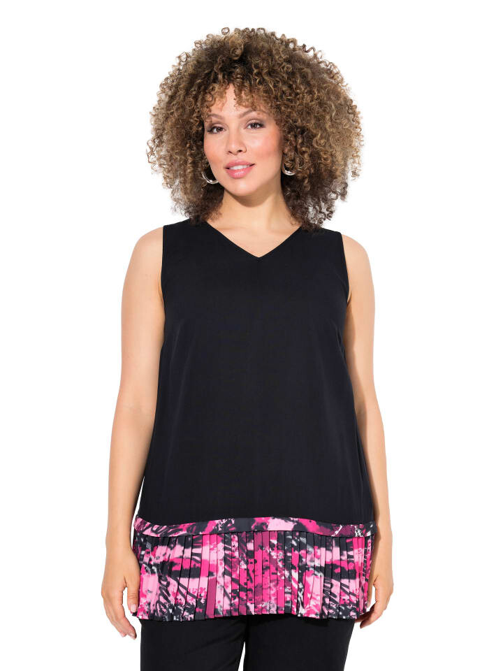 Верх блузки А-силуэта без рукавов из мягкой ткани с принтованным плиссированным низом и V-образным вырезом.
