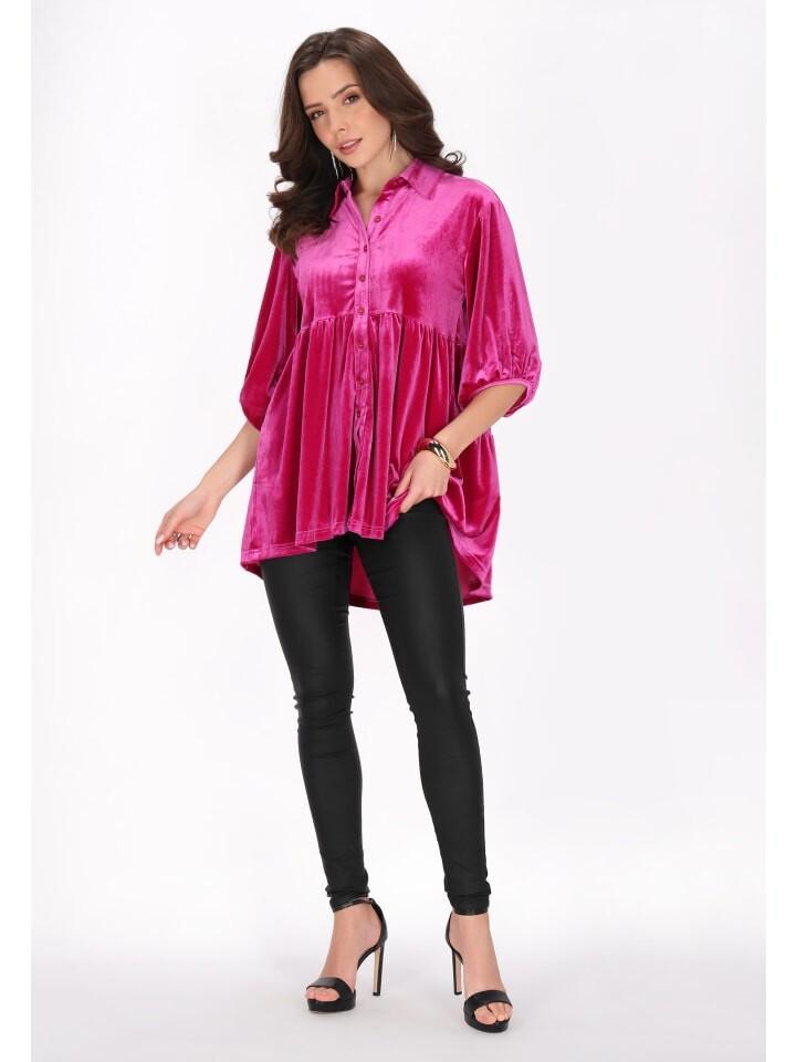 Элегантная рубашка свободного кроя с классическим воротником. Рукава-фонарики 3/4 придают нотку элегантности, а застежка на пуговицы спереди и присборенная талия создают модный силуэт. Эта простая, но шикарная рубашка из роскошного бархата идеально подойдет для любого случая и привлечет к вам всеобщее внимание. Часть коллекции Fashion Look.