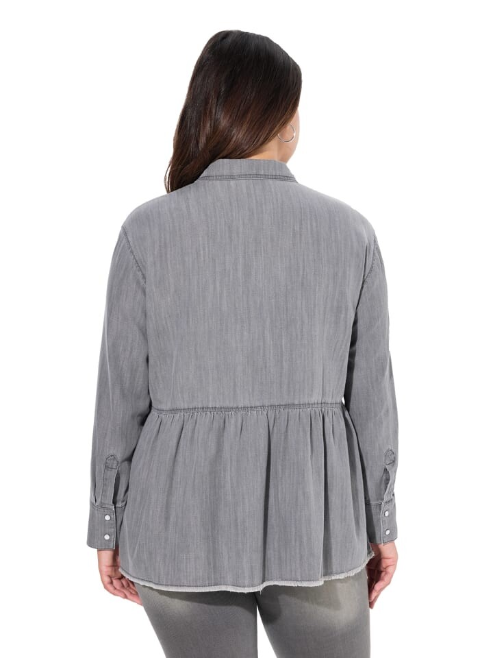 Джинсовая блузка А-силуэта оверсайз, изготовлена из мягкого денима с содержанием лиоцелла. Широкая оборка по подолу. Воротник рубашки, кнопки, 2 кармана с клапанами, подол бахромой. Длинный рукав с манжетами.