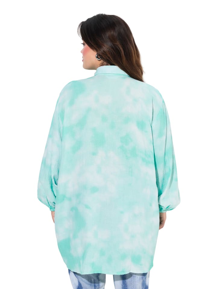 Муслиновая блуза-рубашка удобного кроя, с узором батик и тонкой структурой. Рубашечный воротник, заниженная линия плеча, широкие рукава на резинке.