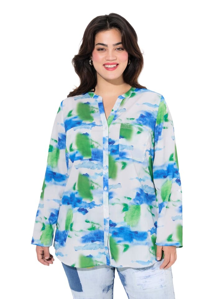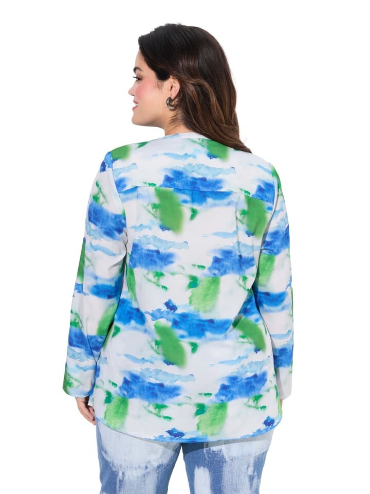 Блуза прямого кроя с принтом тай-дай и пайетками на планке с пуговицами и нагрудных карманах. Вырез туники, длинные рукава с закатанными хлястиками. Слегка закругленный низ с разрезом.