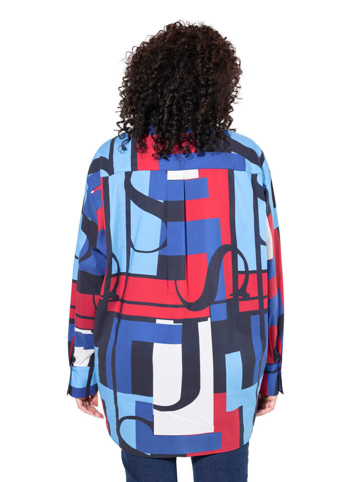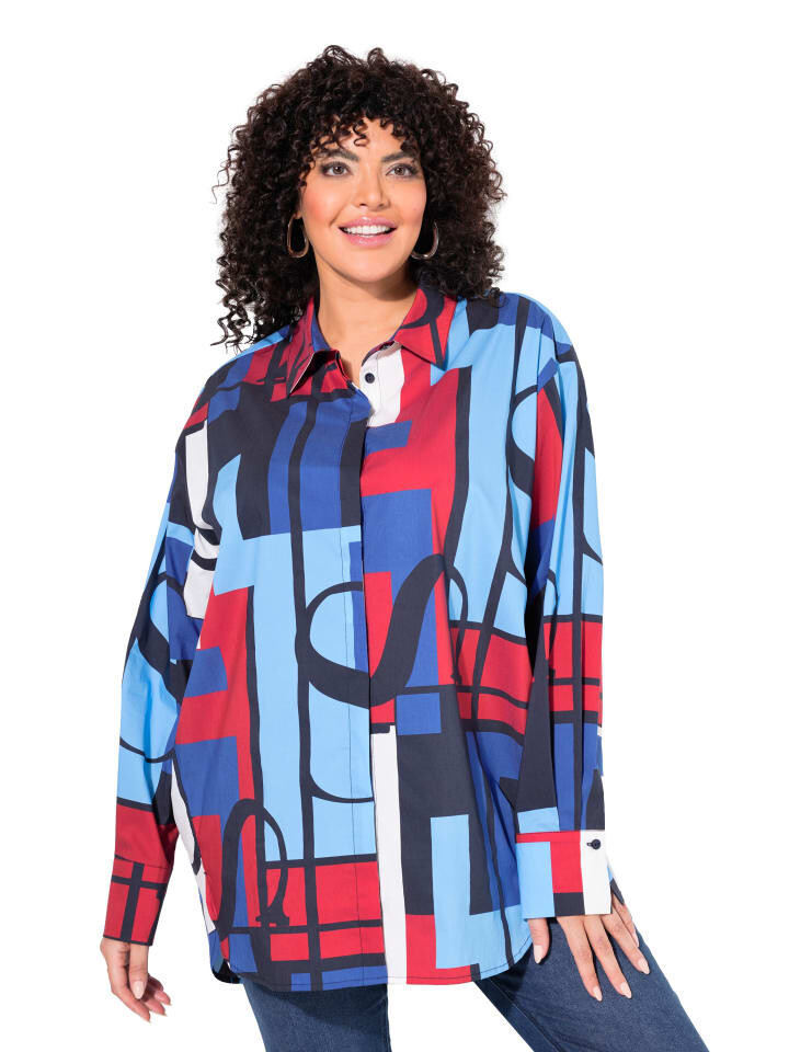 Блузка-рубашка большого размера с графическим узором в стиле колор-блок. Воротник рубашки, планка на потайных пуговицах, подол с закругленными боковыми разрезами. Длинный рукав с манжетами.