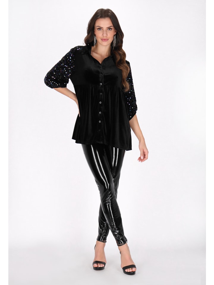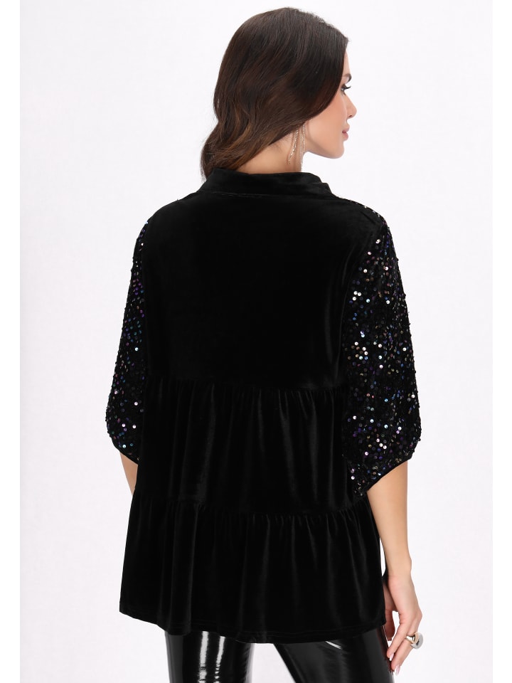 Рубашка свободного кроя с классическим воротником. Рукава 3/4 с пайетками и оборчатый подол добавляют элегантности. Эта рубашка с классическими черными пуговицами и роскошной бархатной текстурой придаст мерцающий штрих вашему вечернему образу. Эта рубашка идеально подойдет для праздничного образа. Это часть Вечерней коллекции.