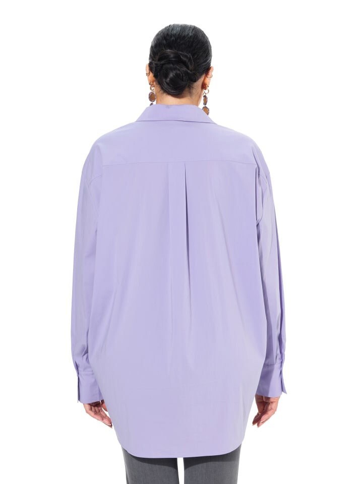 Блузка-рубашка, оверсайз, с рубашечным воротником, планкой на потайных пуговицах и закругленными боковыми разрезами по низу. Длинные рукава с манжетами. Пуговицы из настоящего перламутра.