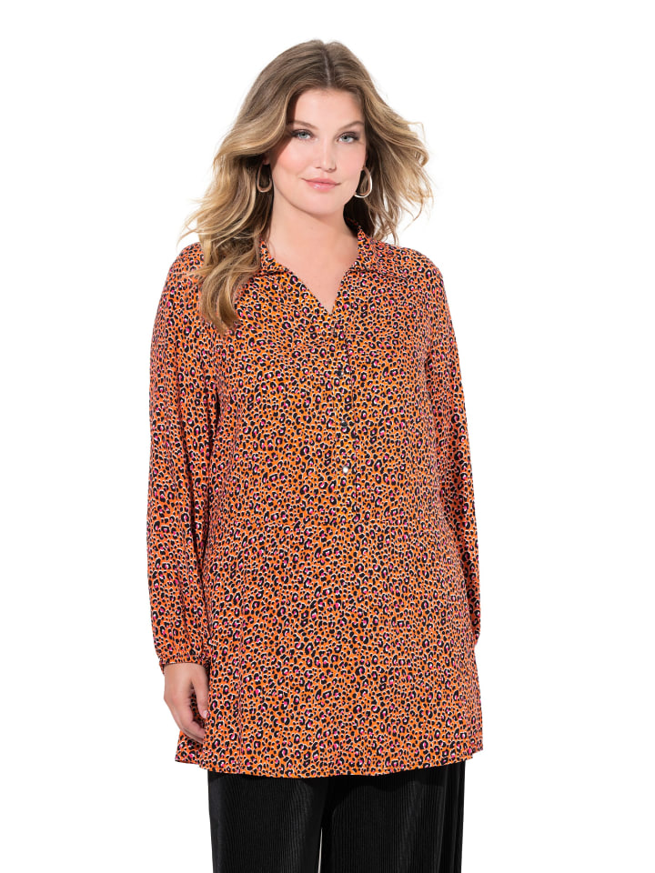Блуза А-силуэта из мягкой вискозы с цветным леопардовым узором и воланом по низу. Воротник рубашки с V-образным вырезом и планкой на половину пуговиц. Длинные рукава с эластичными манжетами.