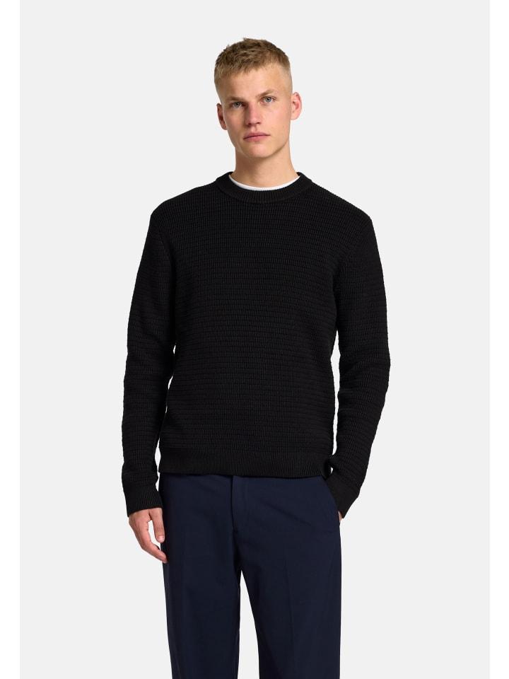 Этот вязаный свитер сочетает в себе неподвластный времени дизайн и удобство. Изготовленная из легкого материала, она имеет стандартную посадку, обеспечивает удобную посадку и универсальные возможности комбинирования. Классический круглый вырез и детали рельефной вязки по краям и вырезу придают свитеру утонченную и стильную структуру. Идеальный компаньон для непринужденного повседневного образа или как элегантный вариант в прохладные моменты – несложный, удобный и всегда подходящий.