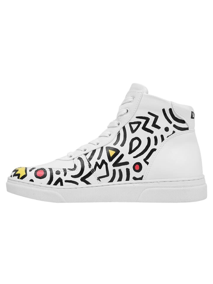 Ботинки DOGO Ace Boots в качестве высоких кроссовок абсолютно модны. Белый дизайн одновременно вневременной и современный, а нежные принты придают привычный шарм DOGO. Благодаря голенищу высотой до щиколотки ботинки Ace напоминают классические баскетбольные кроссовки. Благодаря простому дизайну ботинки Ace очень легко комбинировать, и они позволяют создать как повседневный, так и элегантный образ. Мягкая стелька высоких кроссовок, мягкая голенище и практичная шнуровка с 7 отверстиями обеспечивают особенно высокий уровень комфорта. Дизайн «Abstract Outline White» подходит ко многим стилям. Принт преимущественно состоит из черных графических узоров. Некоторые элементы на обуви выделены жирным желтым и красным цветом, добавляя оттенок цвета этому дизайну Ace Boots.