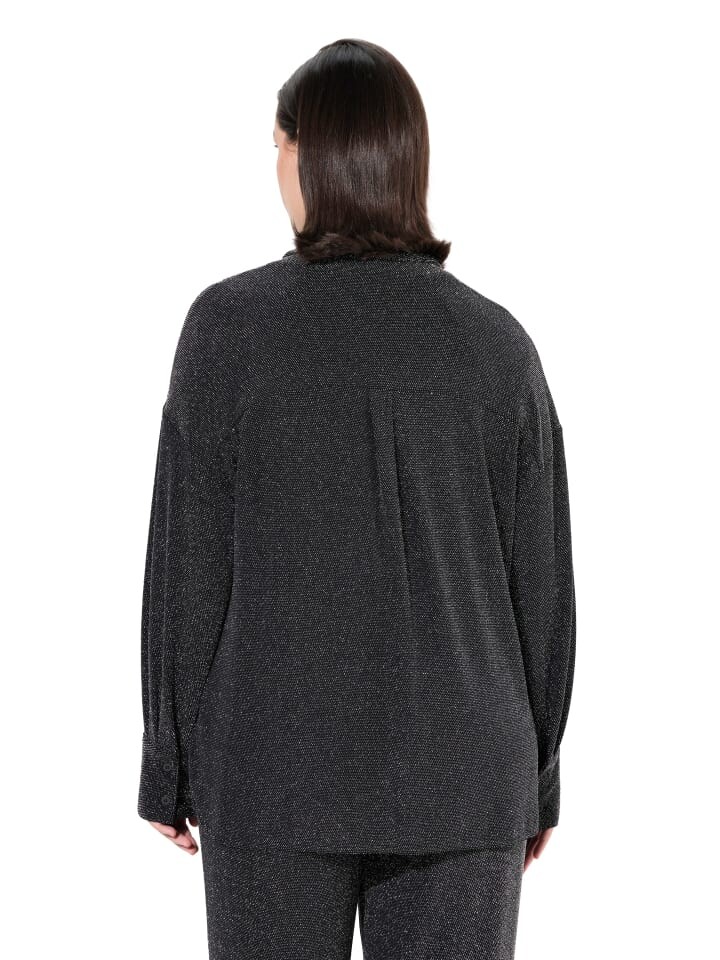 Трикотажная блузка свободного кроя из мягкого блестящего трикотажа – элегантно! Рубашечный воротник, заниженная линия плеча, длинные рукава с широкими манжетами. Закругленный низ с боковыми разрезами - еще больше свободы движений.
