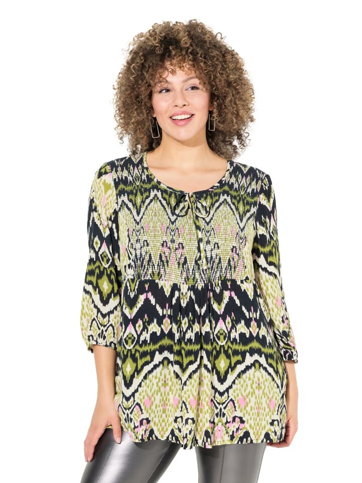 Присборенная блузка А-силуэта из высококачественного вискозного крепа с принтом по всей поверхности. Эластичный присборенный бюст, круглый вырез горловины с разрезом и завязкой. Рукава 3/4 с эластичными манжетами. Боковые разрезы для плавного падения.