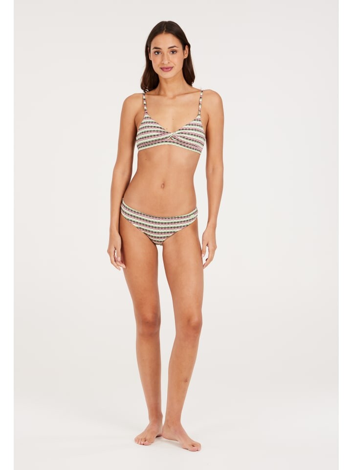 Вот ПРТШАНА из Протеста. Это бикини состоит из топа без косточек и плавок стандартного цвета в тон. На материал нанесен яркий полосатый рисунок, создающий красивый ансамбль. Верх имеет съемные быстросохнущие чашки, которые при необходимости обеспечивают дополнительную поддержку и функциональность. Материал перекручен на груди, что придает изделию шикарный вид. Низ имеет стандартную посадку и талию. Поскольку PRTSHANA является частью наших усилий по повышению экологичности, в ее производстве не использовались ПФУ.