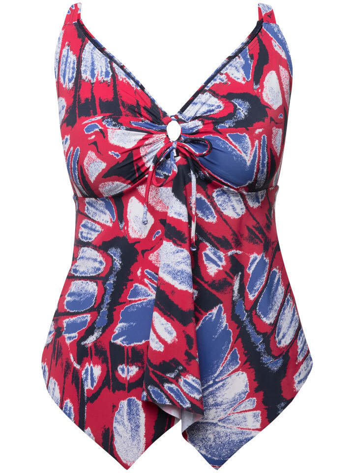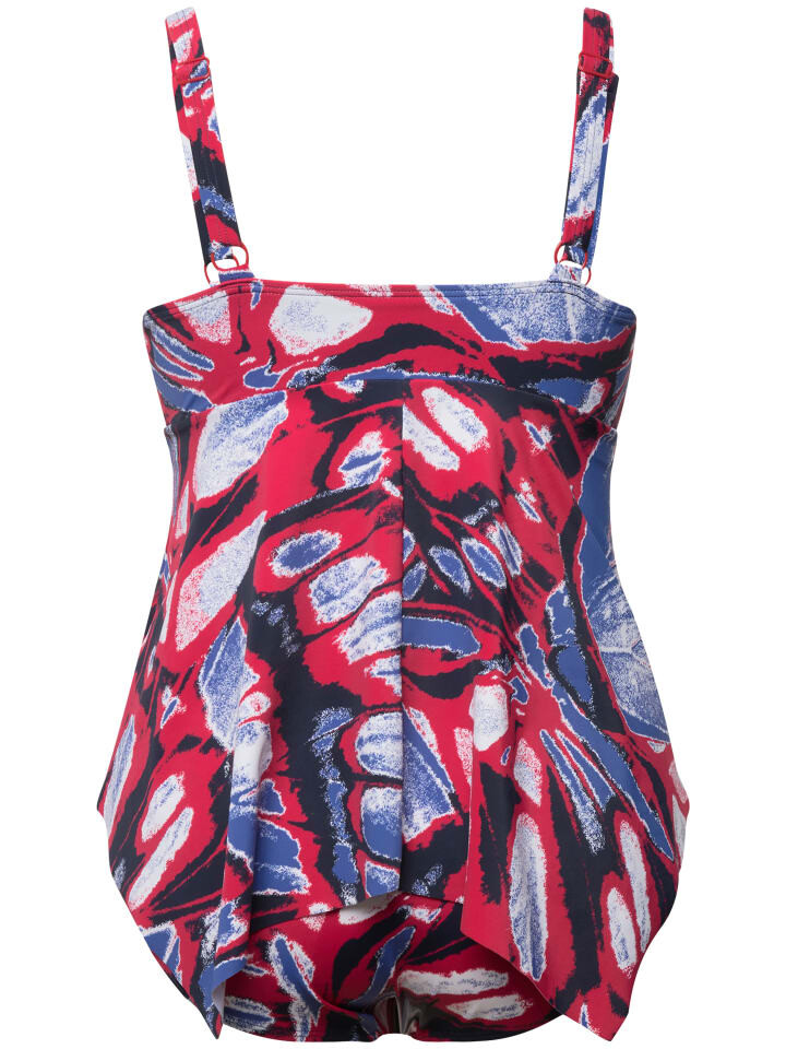 Танкини, костюм-двойка с мягкими чашками и принтом бабочки. Удлиненный топ, женственный драпированный бюст с вырезом, декоративным кольцом и лентой. Заостренный низ, регулируемые бретели, резинка под грудью. Соответствующие трусы. С переработанным полиамидом.