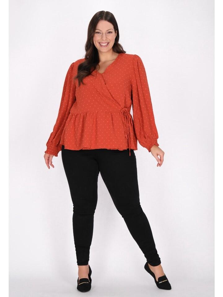 Откройте для себя эту элегантную блузку больших размеров с запахом, с трепещущим V-образным вырезом и смелыми рукавами. Убранная талия позволяет регулировать посадку, красиво подчеркивая силуэт. Эта модель с длинными рукавами, украшенная шикарным узором в горошек, идеально подходит для многих стилей. Этот продукт является частью коллекции Plus Size.