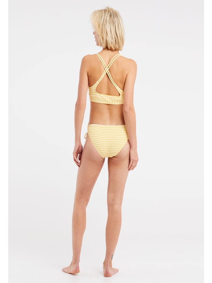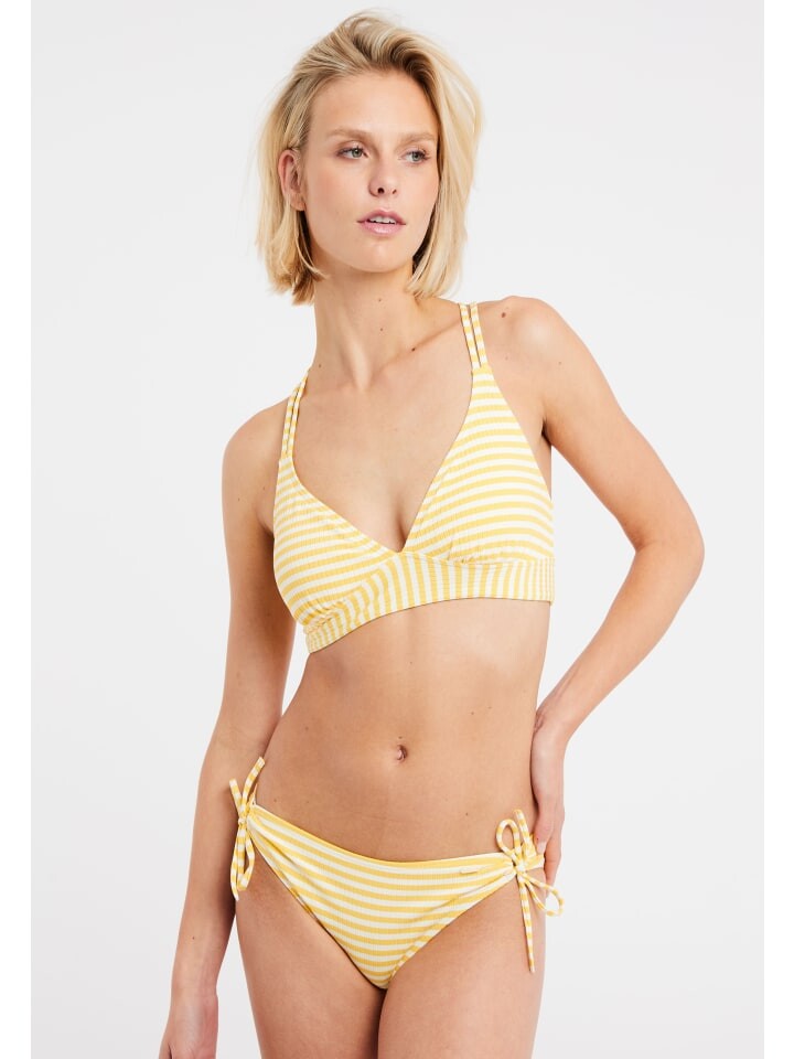 Представляем PRTSUNFISH от Protest. Треугольный верх бикини имеет привлекательный V-образный вырез. Ткань имеет шикарную полоску, окрашенную пряжей, которая создает чудесный эффект. Верх можно полностью обернуть вокруг верхней части тела, устраняя необходимость в застежке сзади. Бретели перекрещиваются на спине. Съемные быстросохнущие подушечки обеспечивают дополнительную поддержку и подчеркивают ваши изгибы. Соответствующие плавки бикини имеют стандартную посадку и талию, а также красивые тканевые банты по бокам. Благодаря нашему стремлению повысить экологичность наших коллекций, при производстве этого бикини не использовались ПФУ. В PRTSUNFISH от Protest вы повсюду распространяете летнюю атмосферу.
