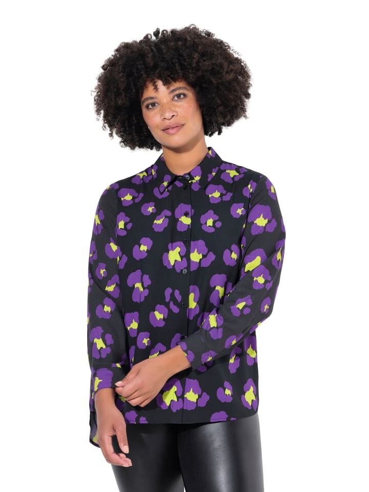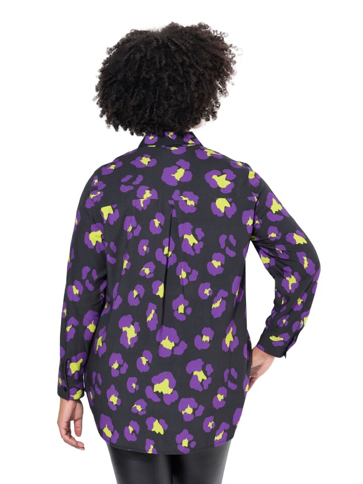 Блуза А-силуэта из мягкой вискозы с цветным леопардовым узором. Воротник рубашки, длинные рукава с манжетами. Закругленный низ и удлиненная спинка.