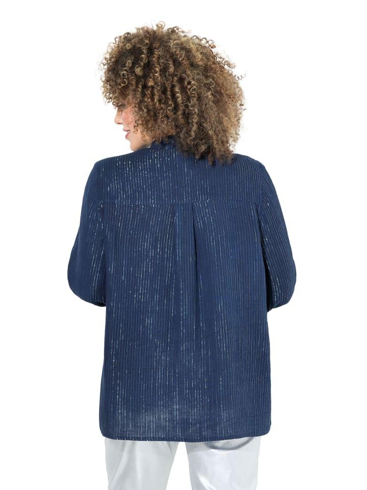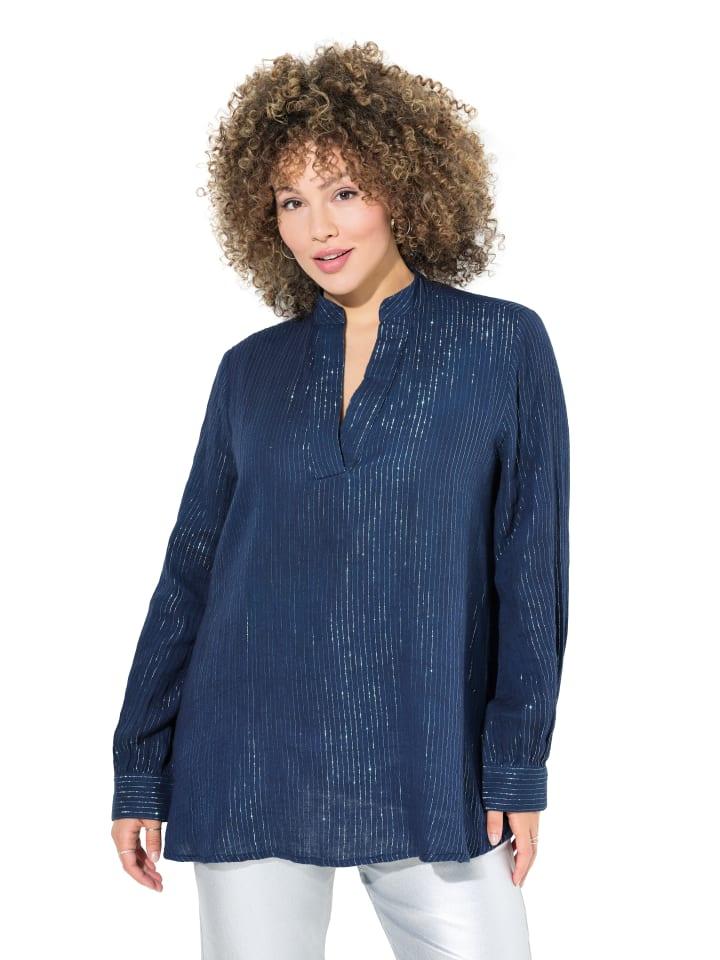 Блуза А-силуэта из мягкой ткани с блестящими полосками Matellic. Воротник стойка с V-образным вырезом, широкие длинные рукава-колокольчики с манжетами. Закругленный низ, сзади примерно на 5 см длиннее.