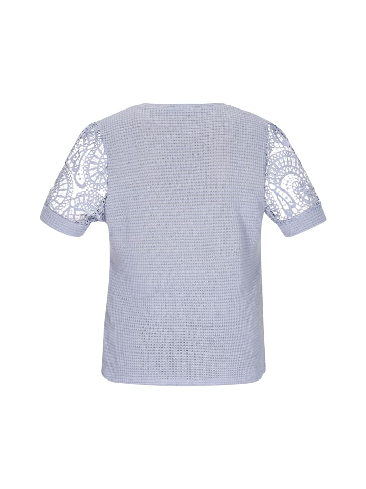 Улучшите свой гардероб этим элегантным топом больших размеров с короткими кружевными рукавами и круглым вырезом. Фактурный трикотаж приятен на ощупь, а замысловатый кружевной узор на рукавах создает женственный и стильный образ. Этот продукт является частью коллекции Plus Size.