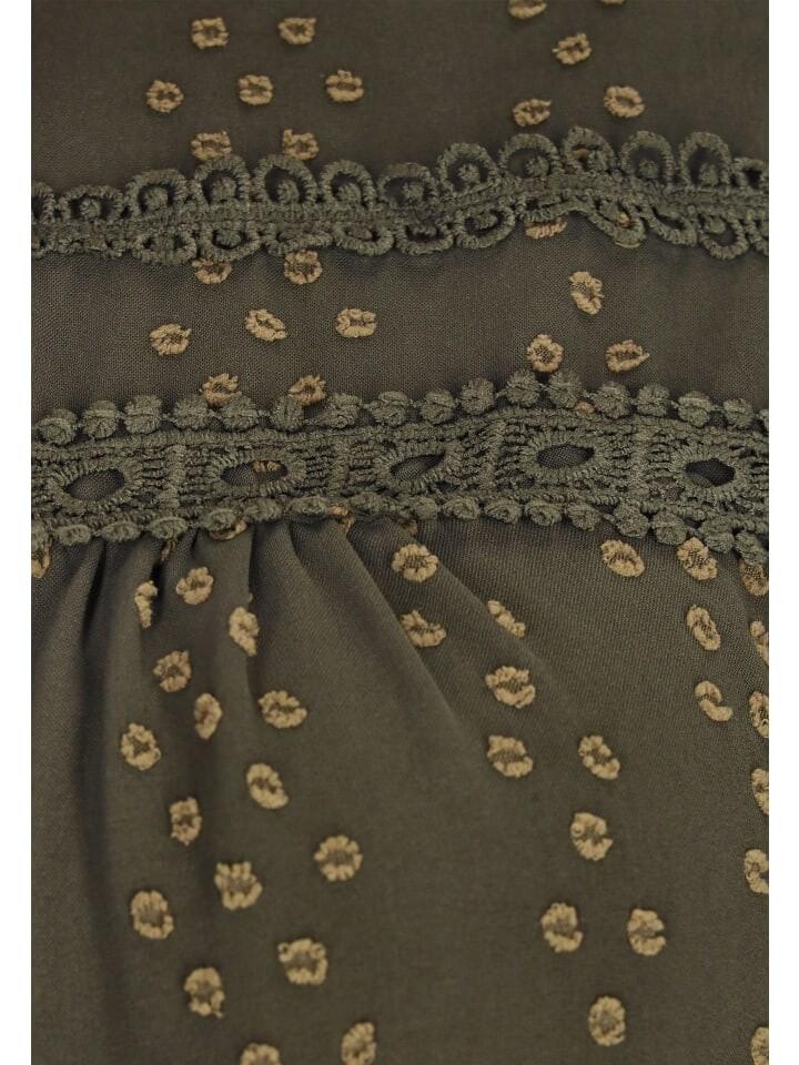 Преобразите свой гардероб с помощью этой блузки больших размеров, предназначенной для повседневной носки. Стильный круглый вырез, украшенный нежной кружевной тесьмой, и длинные рукава слоновой кости придают изделию шик. Очаровательные оборки на плечах подчеркивают привлекательность, а узор в горошек добавляет изящества. Этот продукт является частью коллекции Plus Size.
