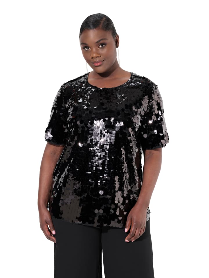 Рубашка с пайетками, свободного кроя, из сетки, полностью украшенной блестящей смесью пайеток, частично прозрачной. Круглый вырез, полурукава.