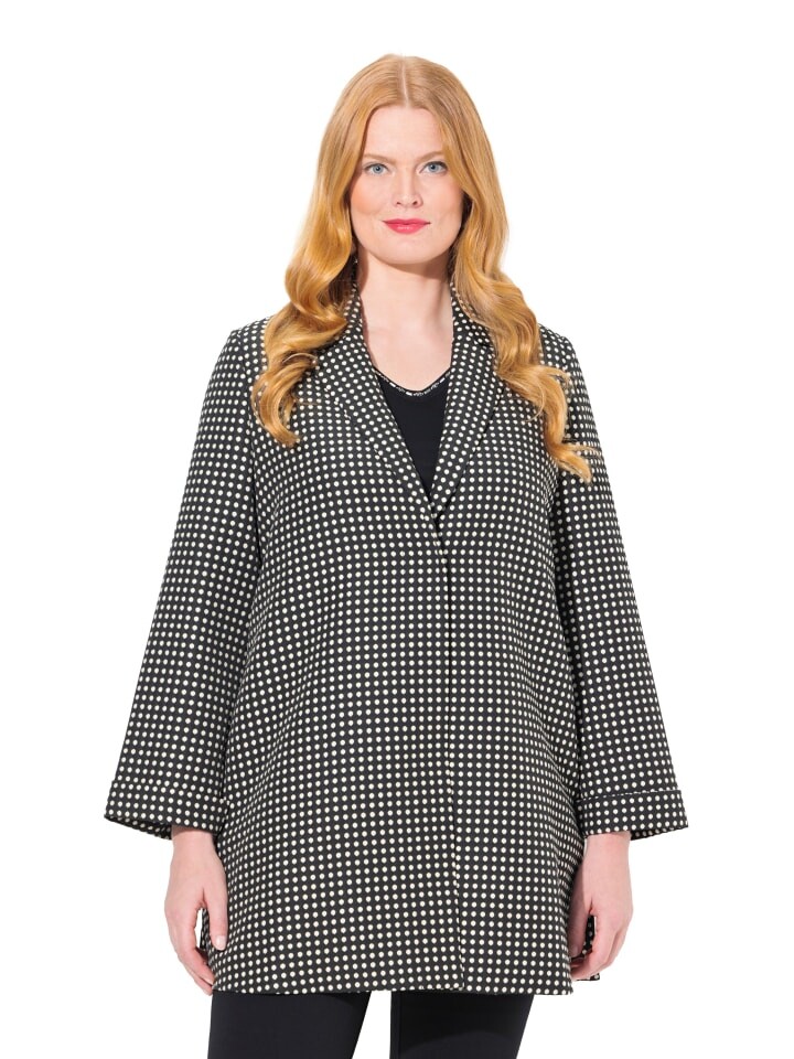 Жаккардовый жакет А-силуэта с высококачественным тканым точечным узором. Воротник с лацканами, планка на потайных кнопках, карманы в боковых швах. Длинные рукава с разрезами по бокам для плавного спада и еще большей свободы движений. Вся подкладка.